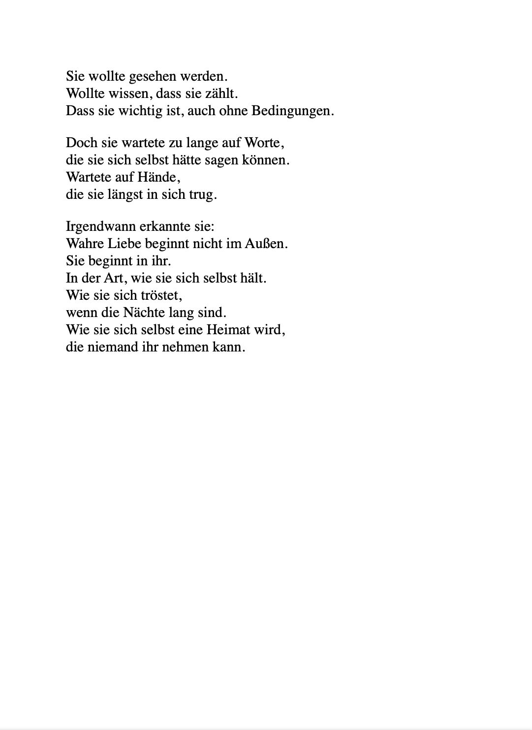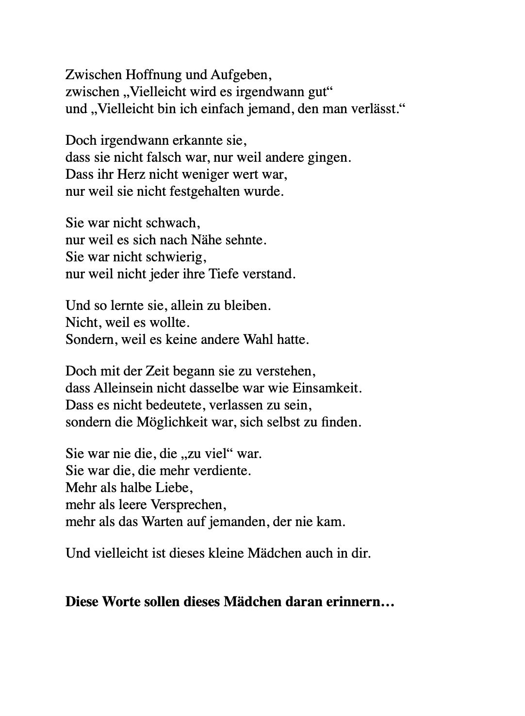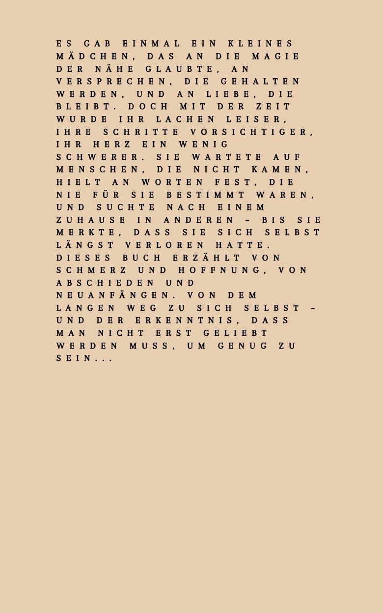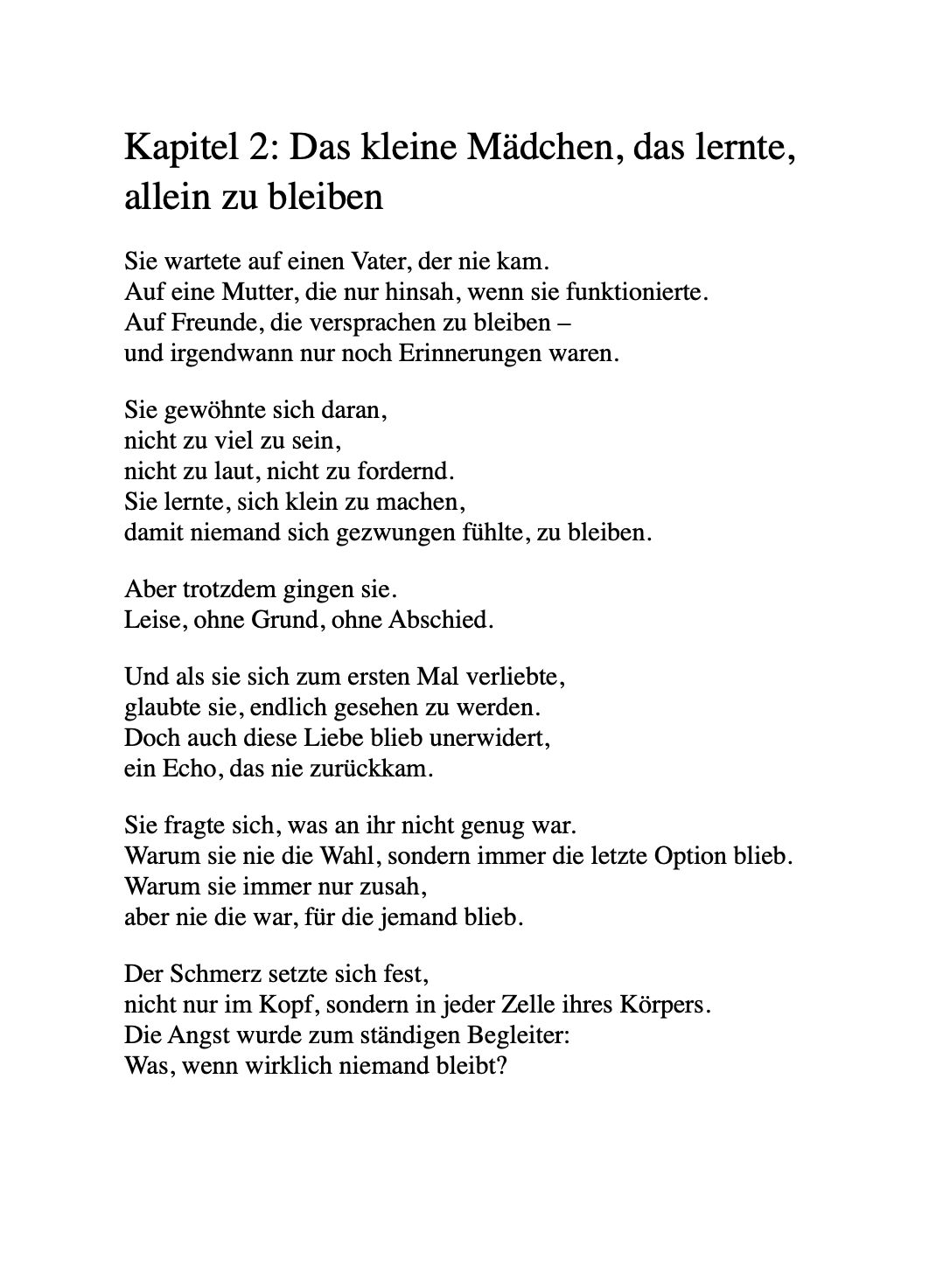 Es gab einmal ein kleines Mädchen. Und dieses Mädchen glaubte, dass es immer eine Hand geben würde, die sie festhält. Sie lachte in den Wind, tanzte über Wiesen und glaubte an die Magie von Nähe und Versprechen. Doch sie war daran gewohnt, zu warten. Auf einen...