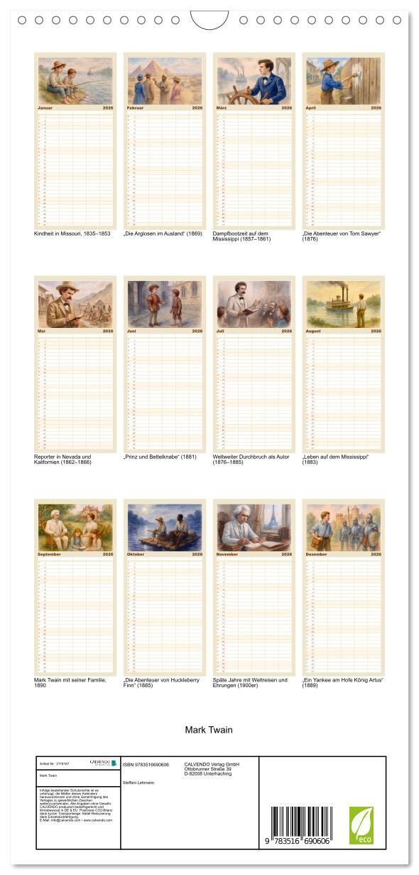 Dieser Kalender lädt ein zu einer bildgewaltigen Reise durch das Leben und Werk von Mark Twain dem wohl bekanntesten Humoristen und Erzähler des amerikanischen 19. Jahrhunderts. Die kunstvollen Illustrationen, die Steffani Lehmann mit Unterstützung einer KI ed...