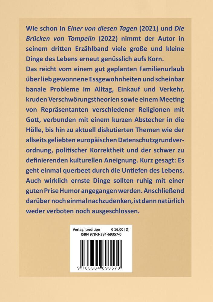 Wie schon in "Einer von diesen Tagen" (2021) und "Die Brücken von Tompelin" (2022) nimmt der Autor in seinem dritten Erzählband viele große und kleine Dinge des Lebens erneut genüsslich aufs Korn. Das reicht vom einem gut geplanten Familienurlaub über lieb gew...