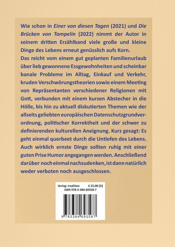 Wie schon in "Einer von diesen Tagen" (2021) und "Die Brücken von Tompelin" (2022) nimmt der Autor in seinem dritten Erzählband viele große und kleine Dinge des Lebens erneut genüsslich aufs Korn. Das reicht vom einem gut geplanten Familienurlaub über lieb gew...