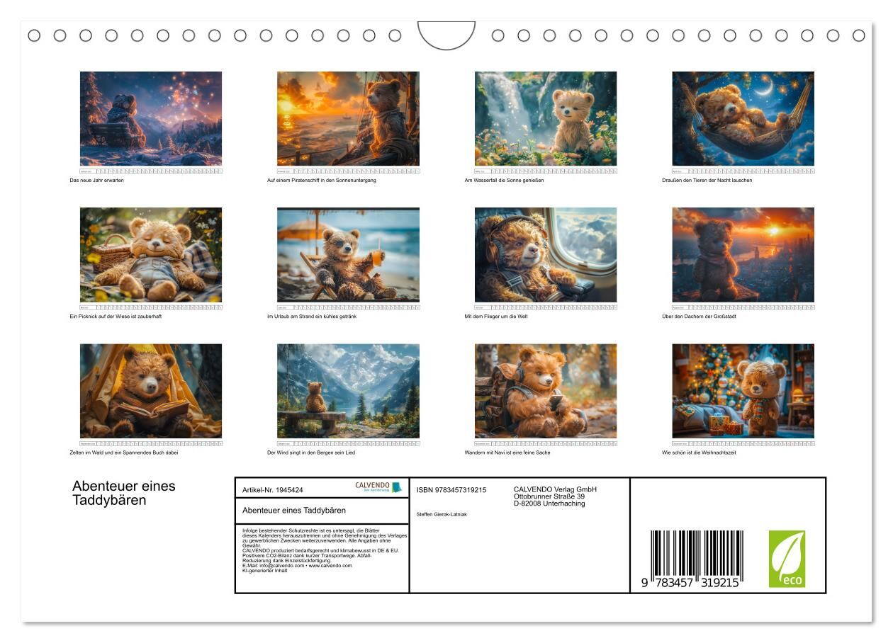 Entdecke die zauberhafte Welt mit dem Kalender "Abenteuer eines Taddybären"! Dieser liebevoll gestaltete Kalender nimmt dich jeden Monat mit auf eine neue, spannende Reise mit Taddy, dem mutigen Bären. Tauche ein in farbenfrohe Illustrationen und herzerwärmend...