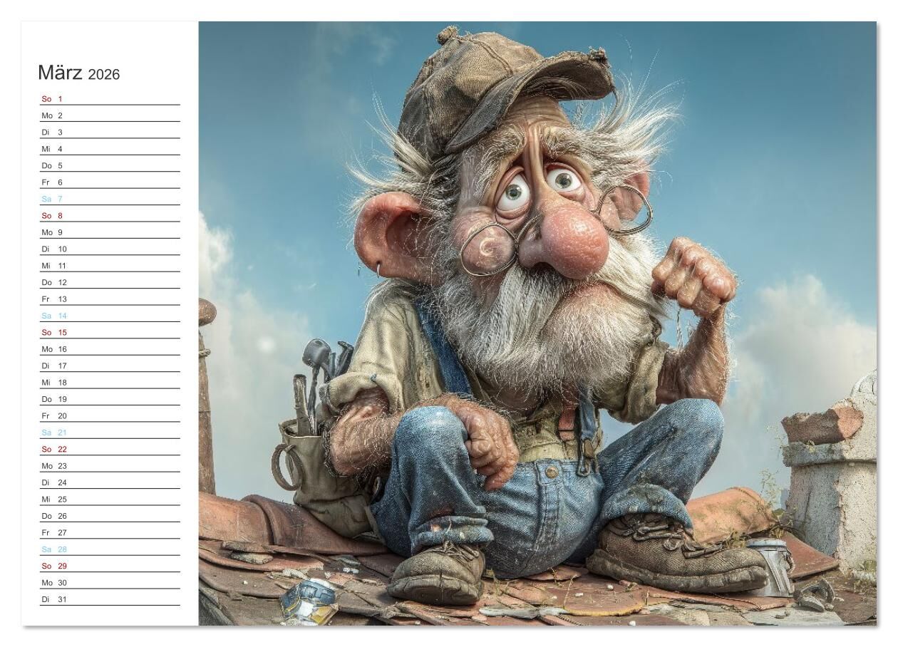 Der Kalender für alle, die vom Ruhestand nur träumen dürfen. Wer hat eigentlich gesagt, dass man im Alter entspannen darf? Dieser Kalender zeigt Monat für Monat, wie Rentner auch mit 80 noch fleißig schuften: Ob als Taxifahrer, Paketbote, Kassierer oder Bürohe...