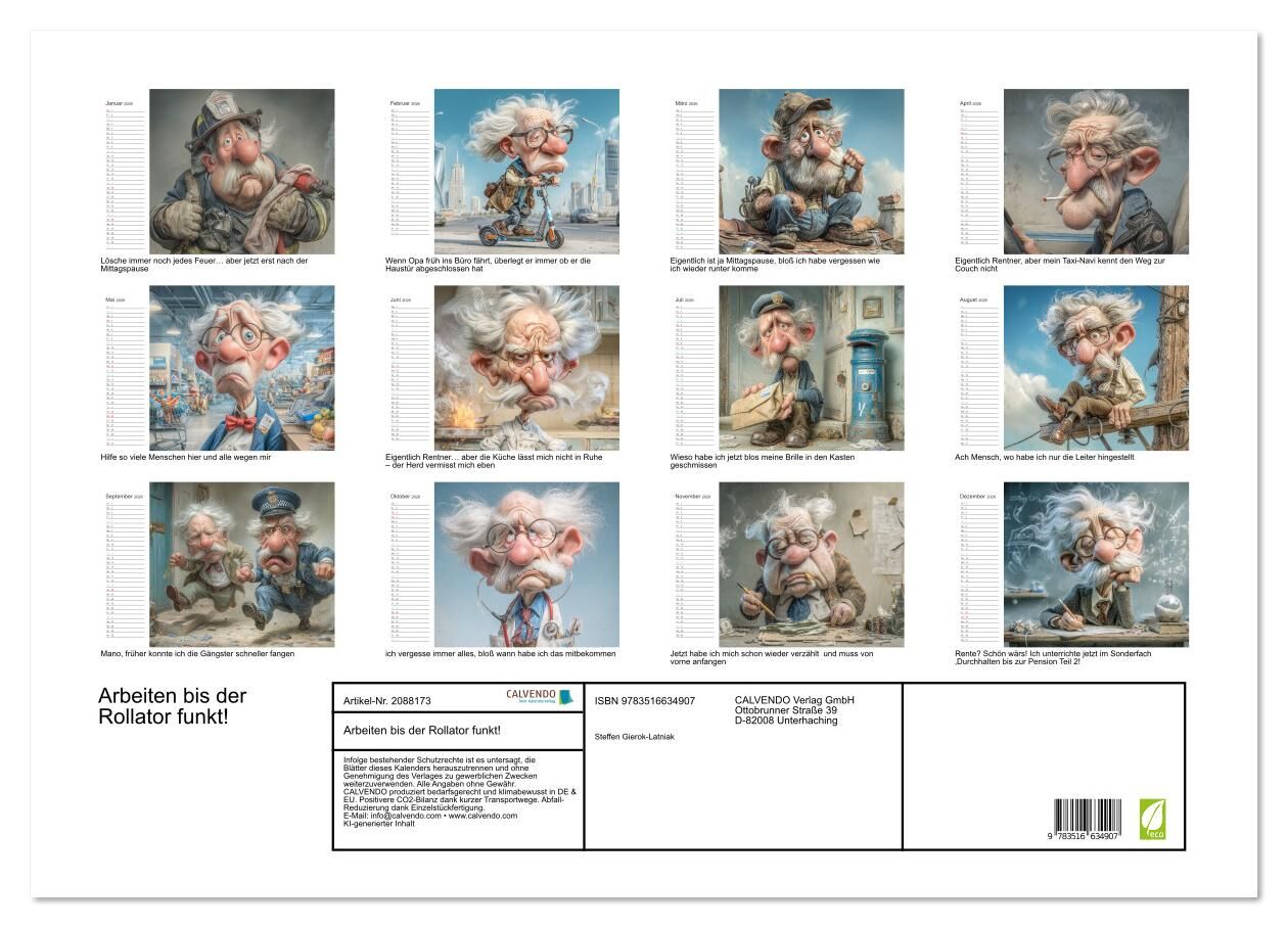 Der Kalender für alle, die vom Ruhestand nur träumen dürfen. Wer hat eigentlich gesagt, dass man im Alter entspannen darf? Dieser Kalender zeigt Monat für Monat, wie Rentner auch mit 80 noch fleißig schuften: Ob als Taxifahrer, Paketbote, Kassierer oder Bürohe...