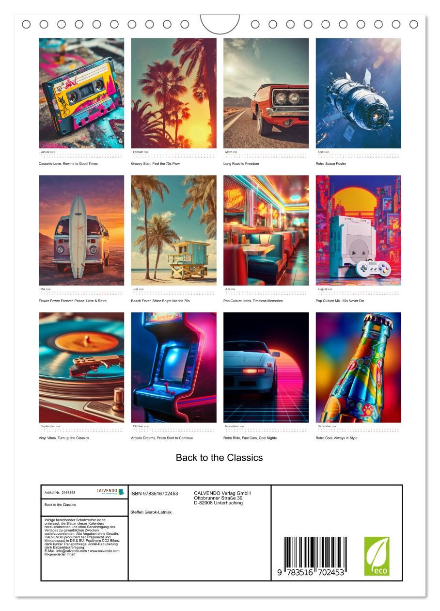 Erlebe die Magie vergangener Jahrzehnte neu. Dieser Retro & Vintage Kalender bringt dir die farbenfrohe Energie der 70er, die Neon-Vibes der 80er und die Popkultur der 90er direkt an die Wand. Ob Disco, Arcade, Skateboard oder VHS-Ästhetik. Denn jedes Moti...