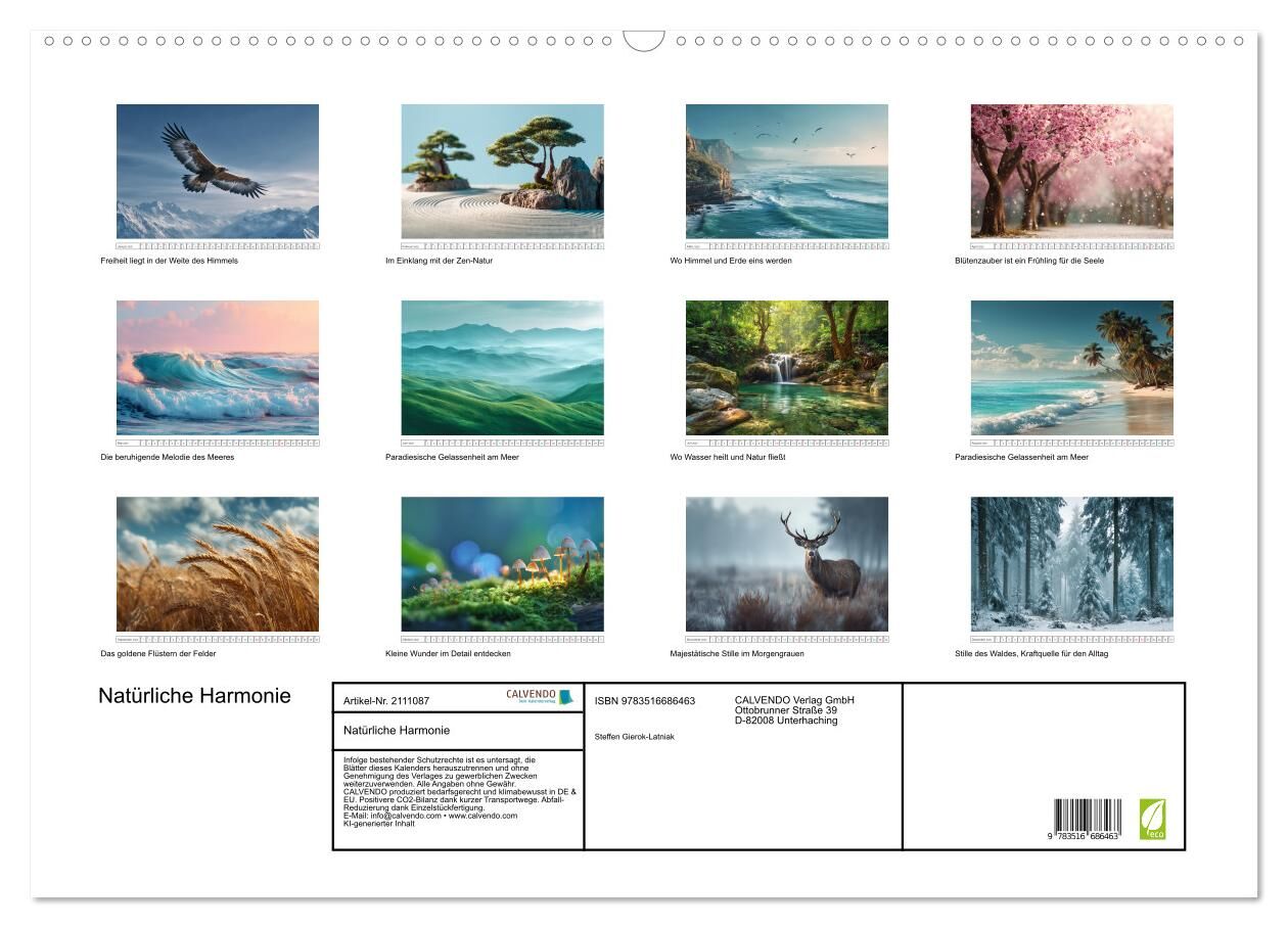 Tauche ein in 12 Monate voller Harmonie, Stille und Naturverbundenheit. Ob sanfte Wellen, blühende Felder oder majestätische Wälder jede Seite dieses Kalenders schenkt dir einen Moment zum Durchatmen. Gefertigt auf nachhaltigen Materialien wie Recyclingpapier ...