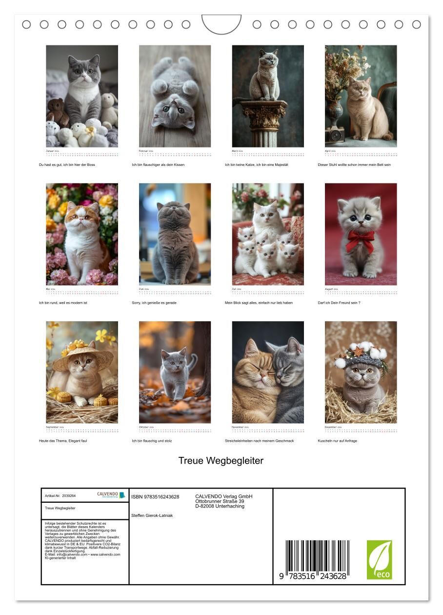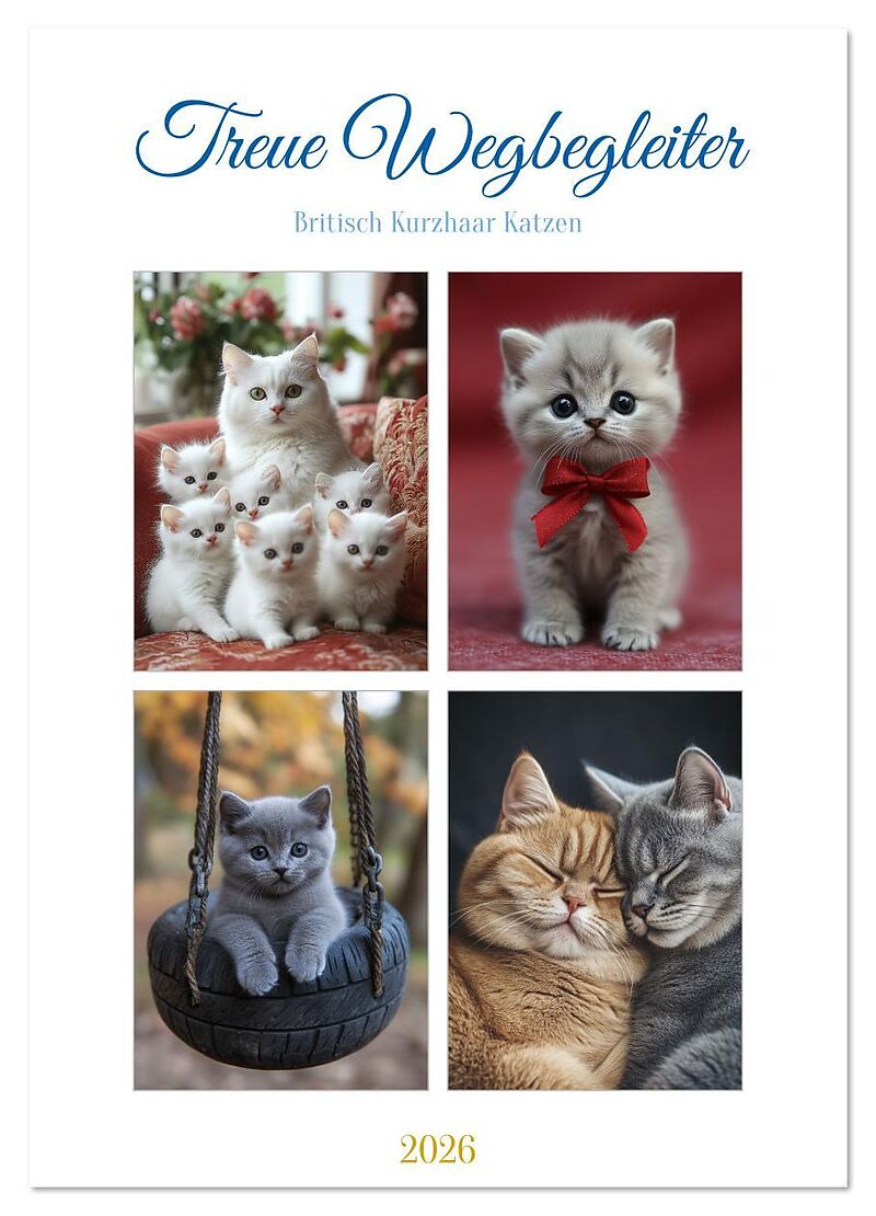 Tauche ein in die Welt der eleganten Britisch Kurzhaar Katzen! Unser exklusiver Kalender "Treue Wegbegleiter" begleitet dich Monat für Monat mit wunderschönen Aufnahmen dieser sanften und majestätischen Katzen. Ihre treue und gelassene Natur macht sie zu wahre...