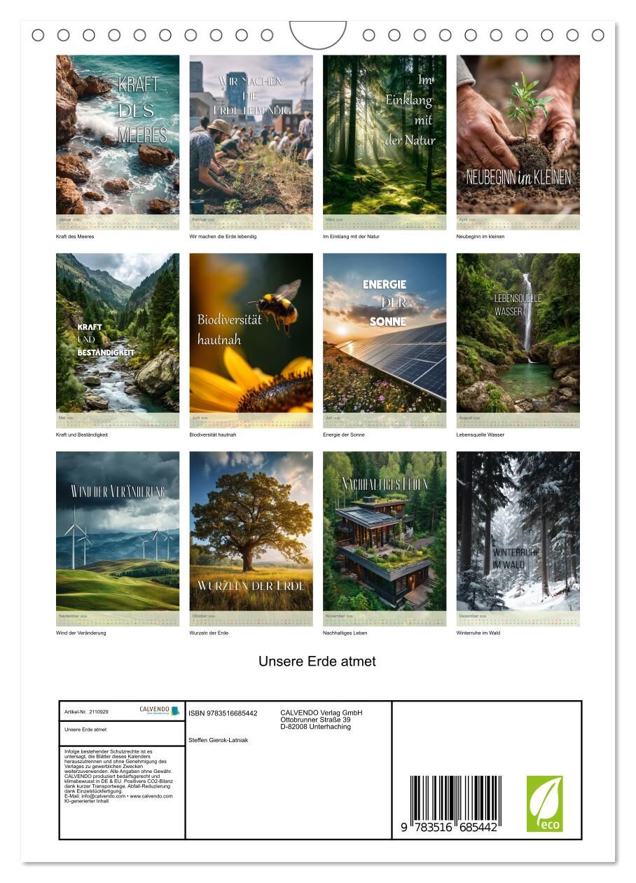Starte inspiriert in jedes Monat und entdecke die Schönheit unserer Erde. Von mächtigen Bäumen über klare Wasserfälle bis hin zu innovativen Ideen für ein grünes Leben. Dieser Kalender verbindet beeindruckende Naturmotive mit Botschaften der Achtsamkeit und er...
