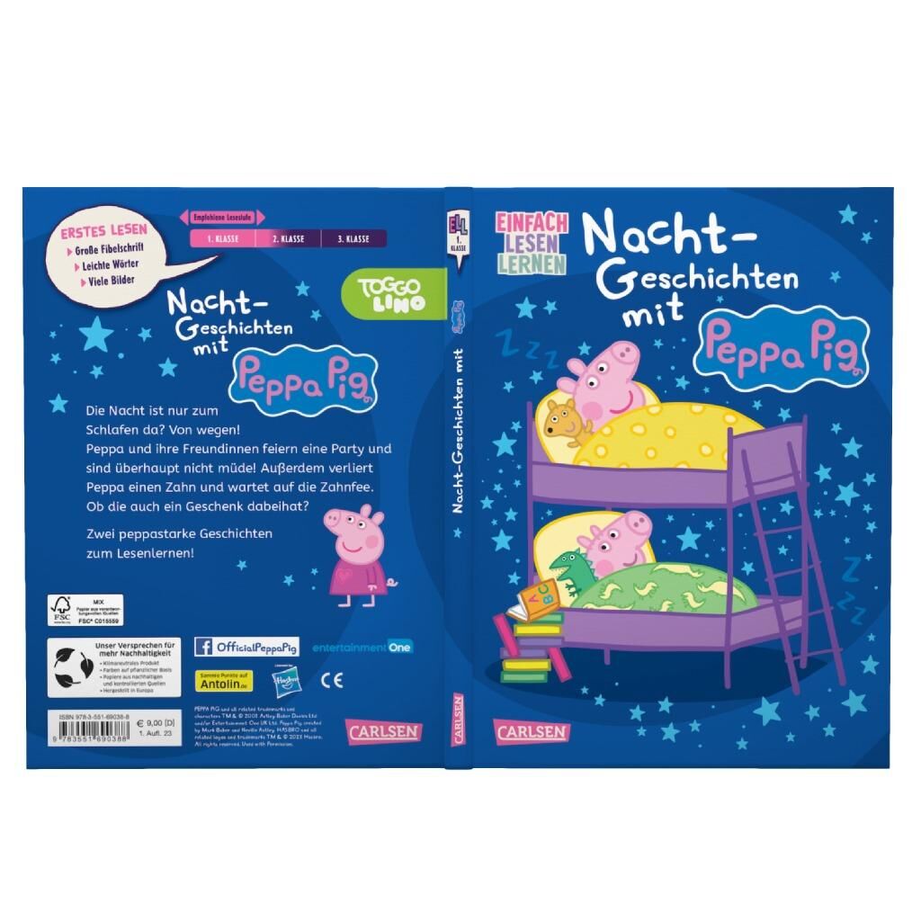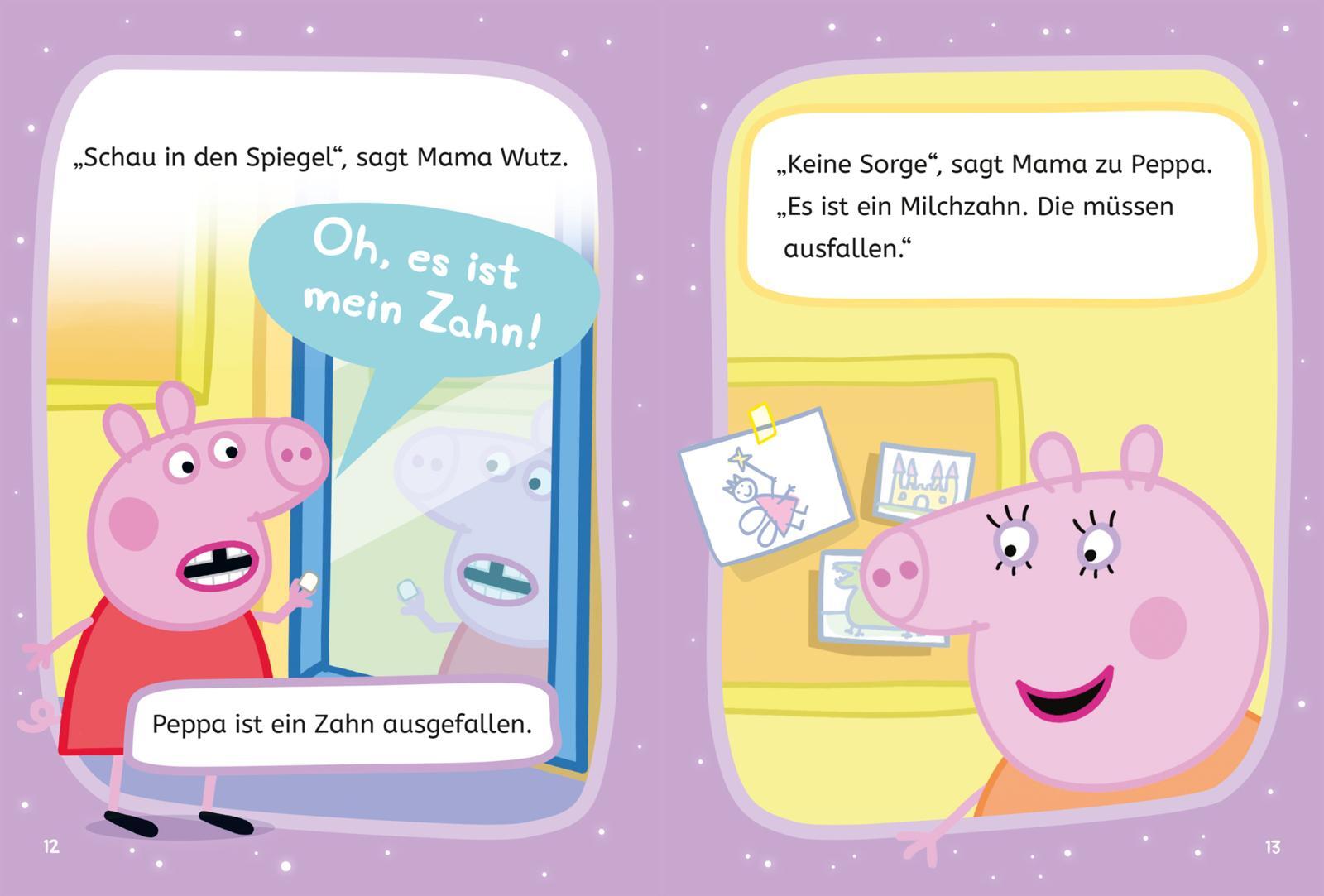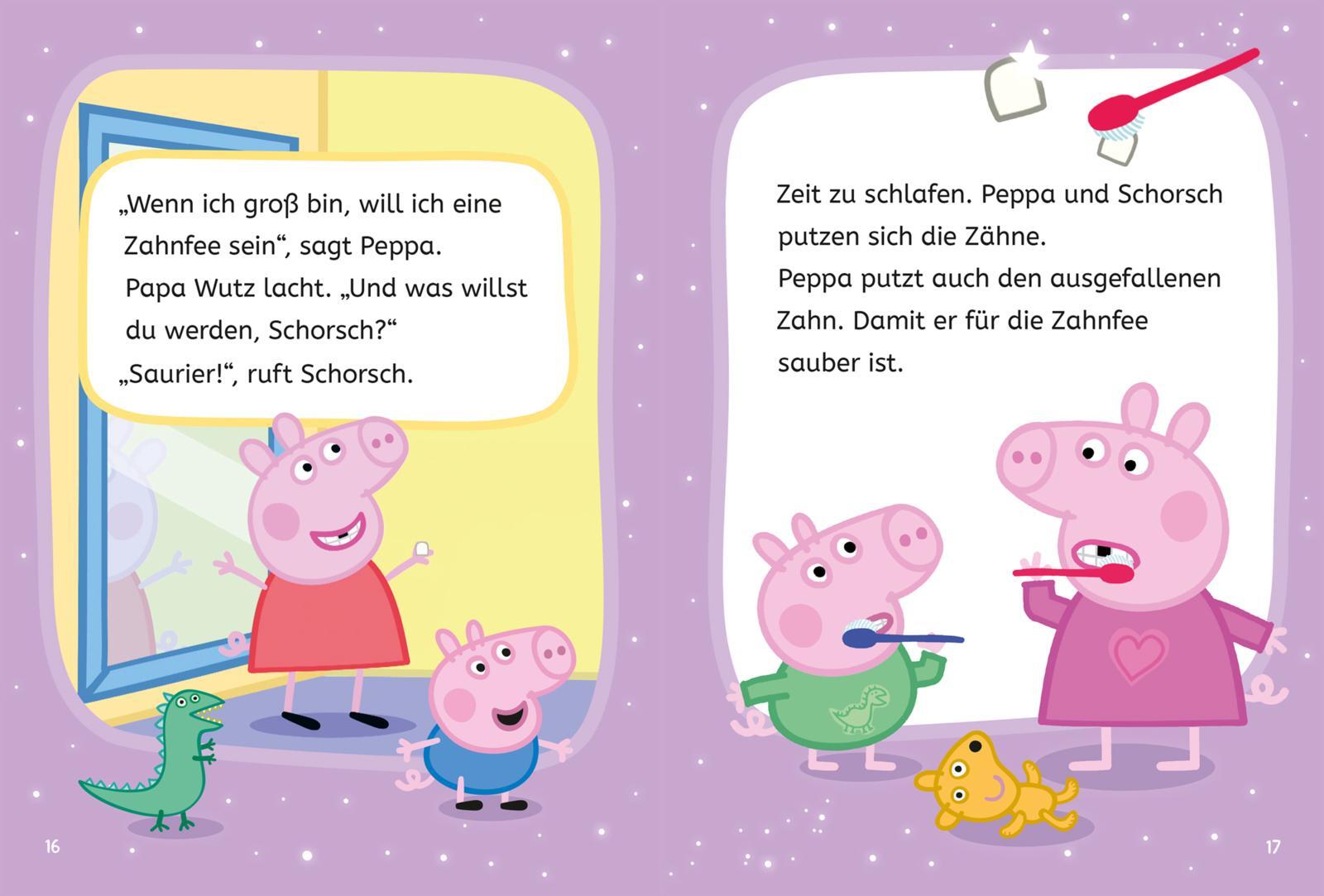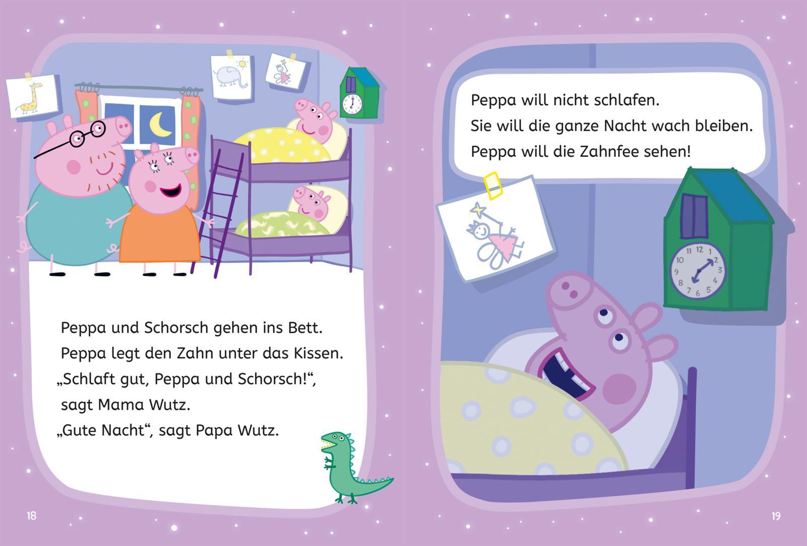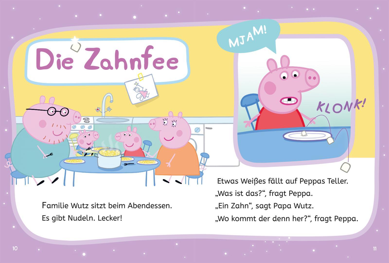 Erstes Lesen lernen mit Peppa Pig! In zwei fröhlichen Gute-Nacht-Geschichten verliert Peppa einen Zahn und geht auf eine Übernachtungsparty! Aber wie soll sie nur einschlafen, wenn abends so aufregende Dinge passieren? Egal, ob Peppa ungeduldig auf die Zahnfe...