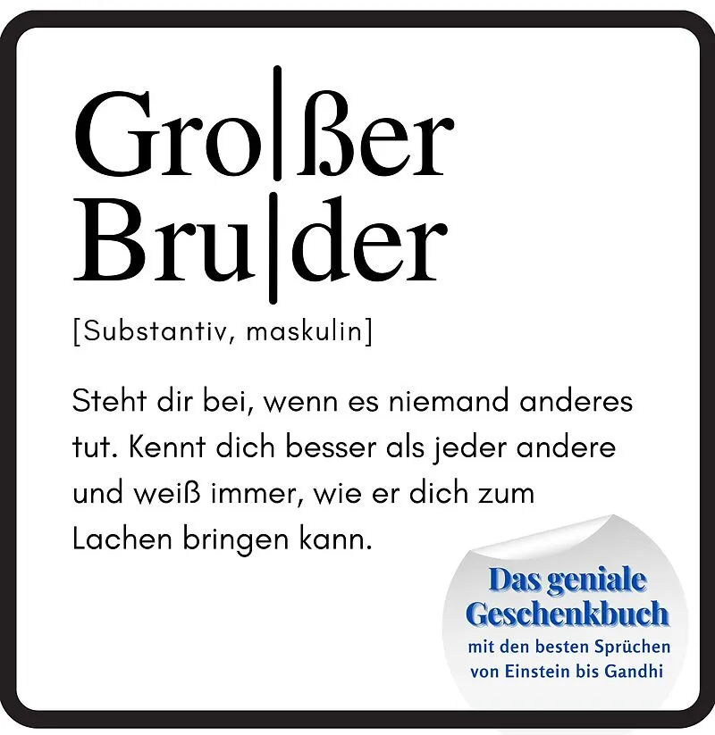 Dieses Buch für den großen Bruder wird viel Freude bereiten. Es ist eine tolle Art, um Danke zu sagen, um Freundschaft und Herzenswärme zu bezeugen und für eine kurzweilige und unterhaltsame Zeit zu sorgen. Am Ende wird alles gut. Und wenn es noch nicht gut is...