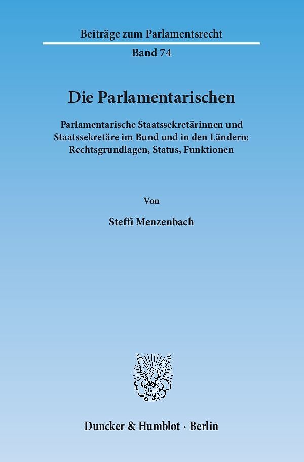 »Parliamentary State Secretaries in the Federation and the Länder: Legal Framework, Status, Functions« This work is the first comprehensive legal analysis of the office of parliamentary state secretaries in the Federation and comparable offices in the Länder. The author shows the scope for action that parliamentary and status law grants the incumbents. In addition, by taking a function-based view of the role that »parliamentaries« play in legislation, oversight and the public, she demonstrates the specific benefits of the office for parliament.