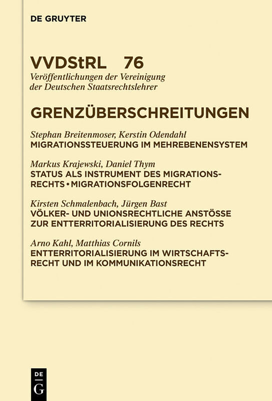 Dieser Band enthält die Referate und Diskussionen der Tagung der Deutschen Staatsrechtslehrer in Linz vom 5. bis 8. Oktober 2016. Inhalt Grenzüberschreitungen Migration 1. Migrationssteuerung im Mehrebenensystem ( Stefan Breitenmoser , Basel; Kerstin Odendahl ...