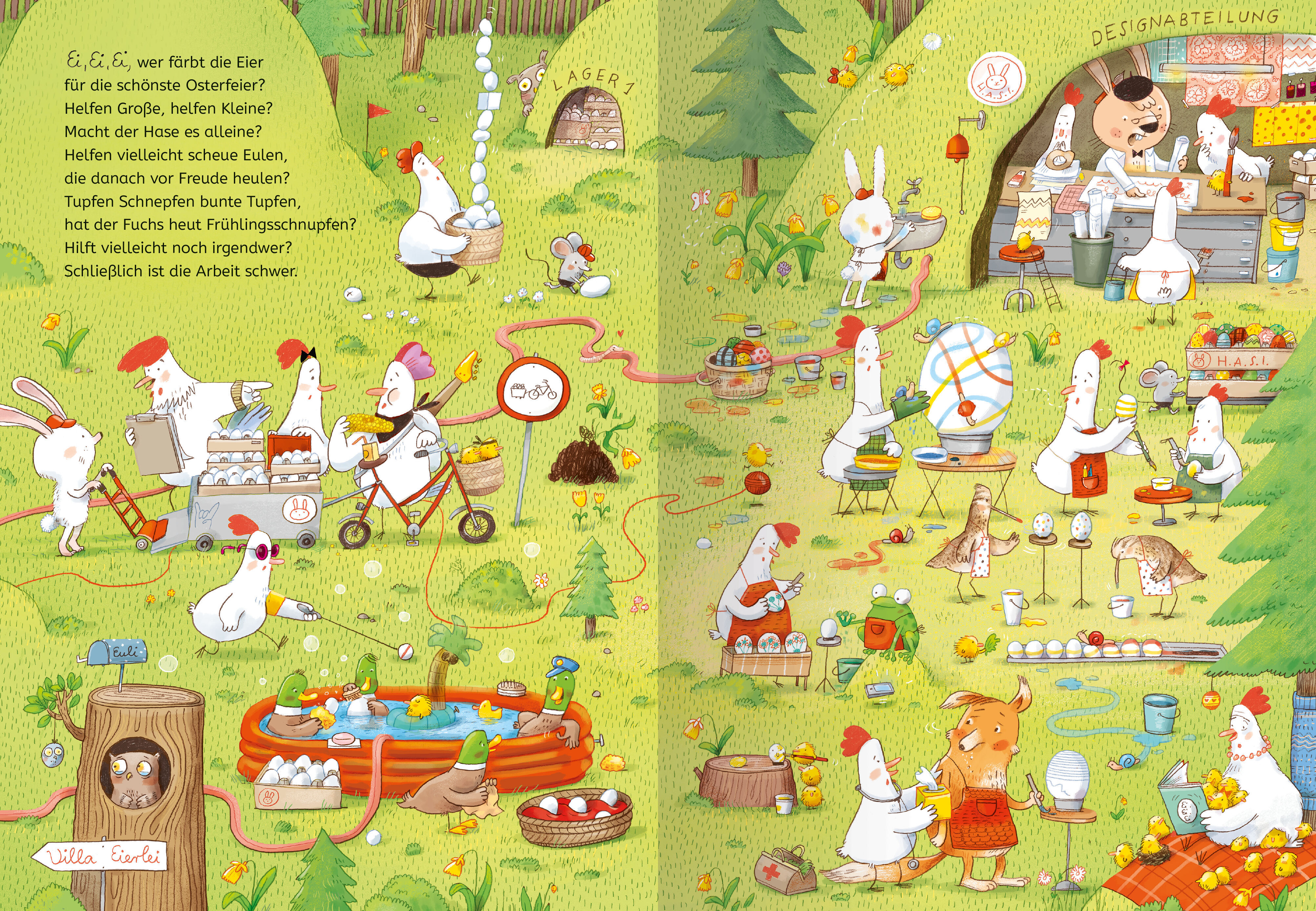 Bald kommt der Osterhase! Während die Kinder sehnsüchtig auf den Osterhasen warten und sich auf das Eiersuchen am Ostersonntag freuen, haben der Osterhase und seine Helfer eine ganze Menge zu tun: Schließlich müssen die Eier erst einmal gelegt und bemalt werde...