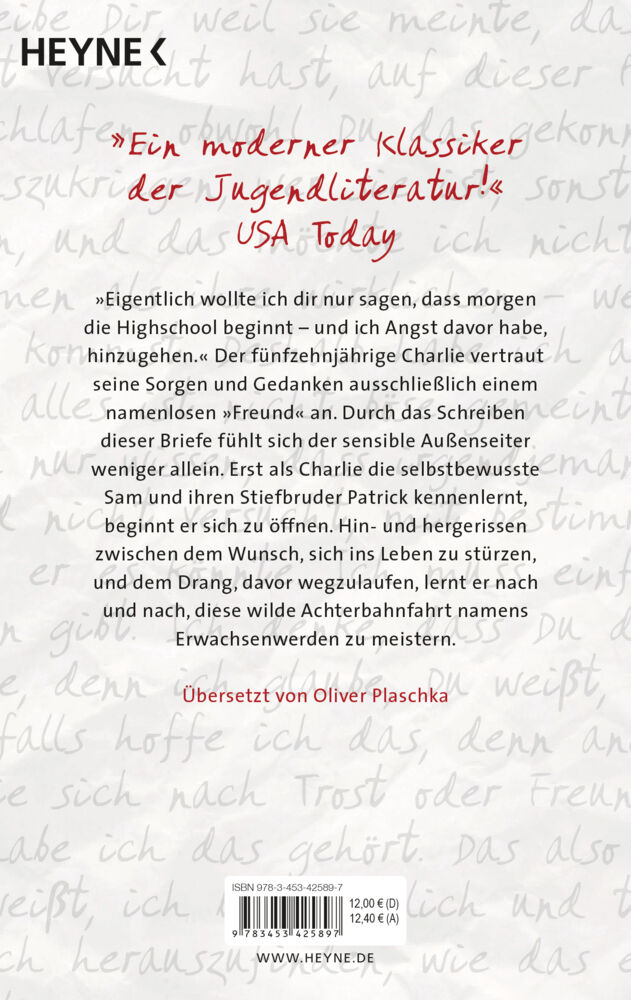 »Ein moderner Klassiker der Jugendliteratur!« USA Today »Eigentlich wollte ich dir nur sagen, dass morgen die Highschool beginntund ich Angst davor habe, hinzugehen.« Der fünfzehnjährige Charlie vertraut seine Sorgen und Gedanken ausschließlich einem namenlose...