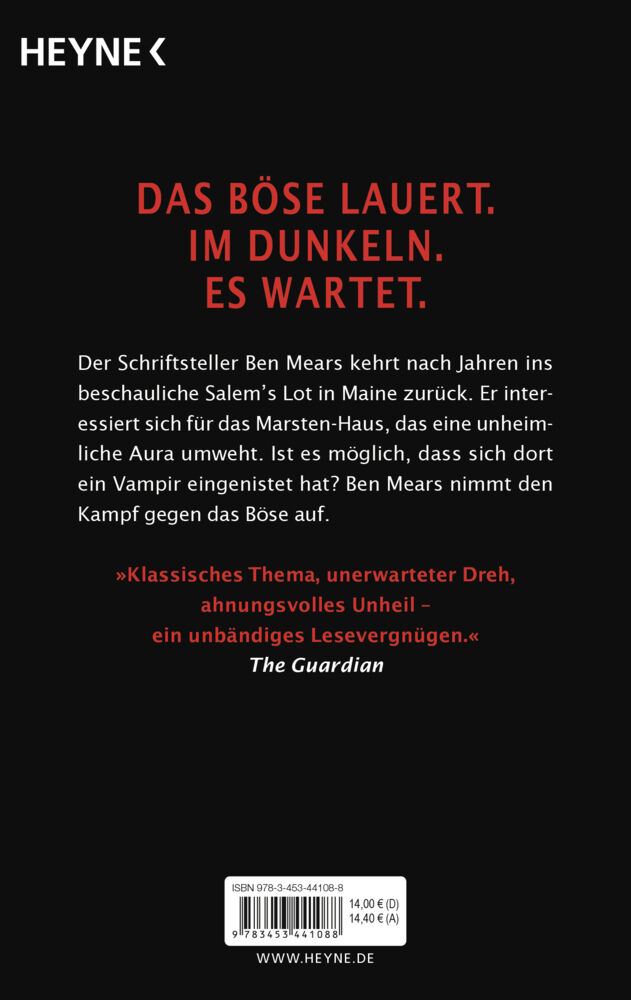 Das Meisterwerk, das neue Maßstäbe in der Horrorliteratur gesetzt hat Ben Mears kehrt nach Salem's Lot zurück und interessiert sich dort für das Marsten-Haus. Von diesem Haus geht eine unheimliche Kraft aus, und bald zeigt sich, wer in Salem's Lot sein Unwesen...