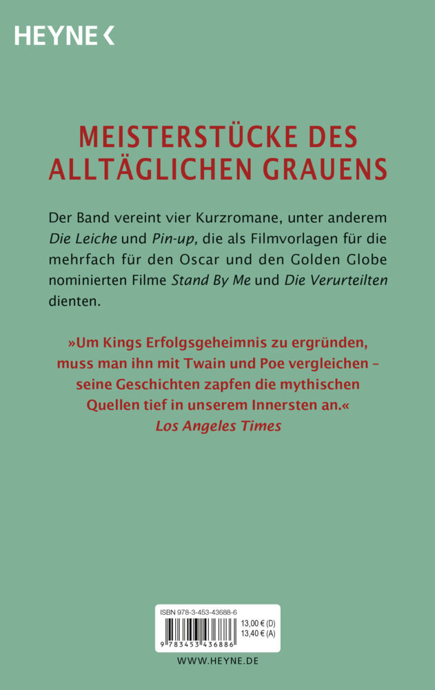 Meisterstücke des alltäglichen Grauens Der Band vereint vier Kurzromane, darunter Die Leiche und Pin-up , die als Filmvorlagen für die mehrfach für den Oscar und den Golden Globe nominierten Filme Stand By Me und Die Verurteilten dienten. Autorentext Stephen K...