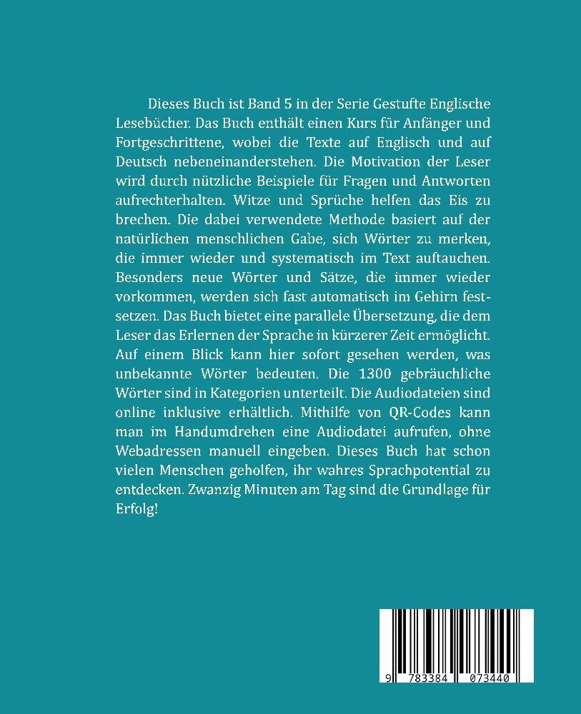 Dieses Buch ist Band 5 in der Serie Gestufte Englische Lesebücher. Das Buch enthält einen Kurs für Anfänger und Fortgeschrittene, wobei die Texte auf Englisch und auf Deutsch nebeneinanderstehen. Die Motivation der Leser wird durch nützliche Beispiele für Frag...