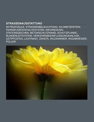 Quelle: Wikipedia. Seiten: 38. Kapitel: Notrufsäule, Straßenbeleuchtung, Kilometerstein, Fahrzeugrückhaltesystem, Wegweisung, Stationszeichen, Betonschutzwand, Schutzplanke, Blindenleitsystem, Verkehrsbeeinflussungsanlage, Leitpfosten, Lichtmast, DWiSta, Wildw...