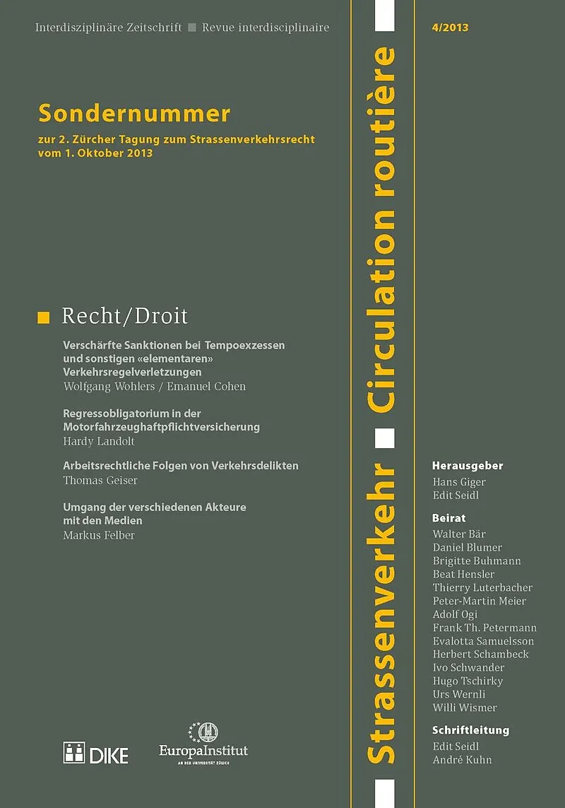 Wolfgang Wohlers / Emanuel Cohen: Verschärfte Sanktionen bei Tempoexzessen und sonstigen 'elementaren' Verkehrsregelverletzungen Hardy Landolt: Regressobligatorium in der Motorfahrzeughaftpflichtversicherung Thomas Geiser: Arbeitsrechtliche Folgen von Verkehrs...