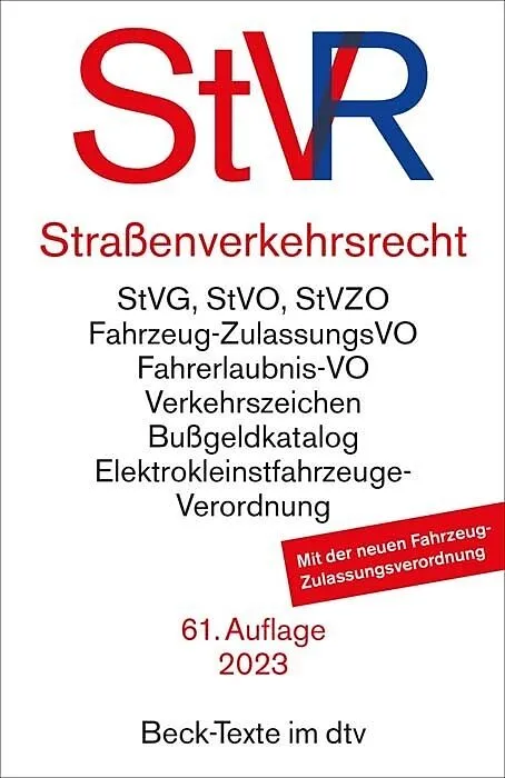 InhaltAutobahn-Richtgeschwindigkeits-V, Bußgeldkatalog, Fahrerlaubnis-VO, FahrpersonalVO, Fahrzeug-ZulassungsVO, Katalog der Verkehrszeichen, Elektrokleinstfahrzeuge-Verordnung, PflichtversicherungsG, Strafgesetzbuch (Auszug), Strafprozessordnung (Auszug), Str...