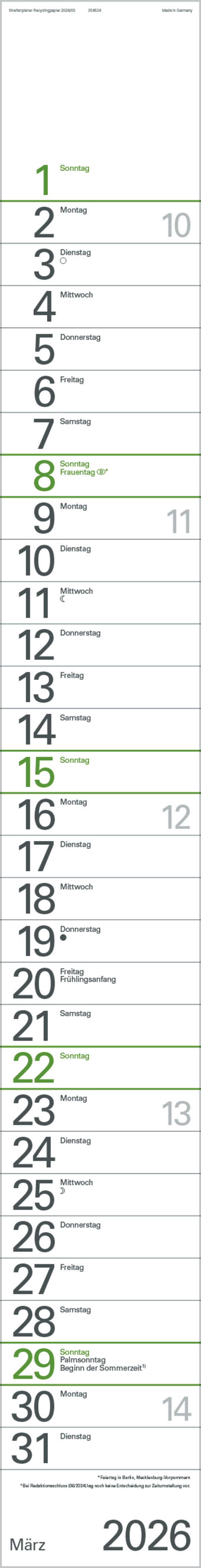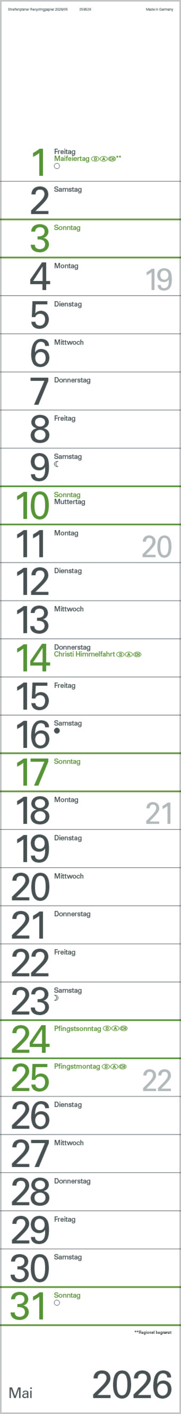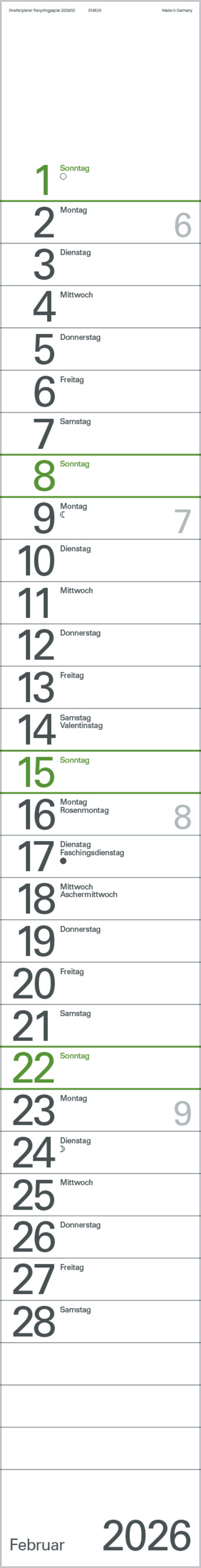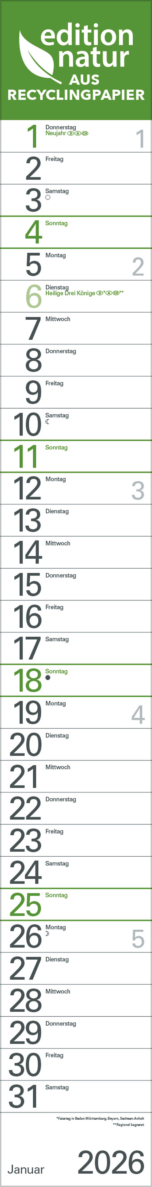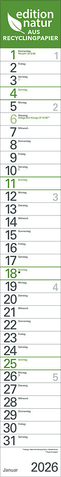 Produktmerkmale • Format: 11,4 x 89 cm; schmaler Wandkalender mit viel Platz für Termine • Kalendarium auf Deutsch mit hervorgehobenen Sonn- und Feiertagen für D, A und CH • Monatsblätter zum Abreißen • Gedruckt auf umweltfreundlichem Recyc...