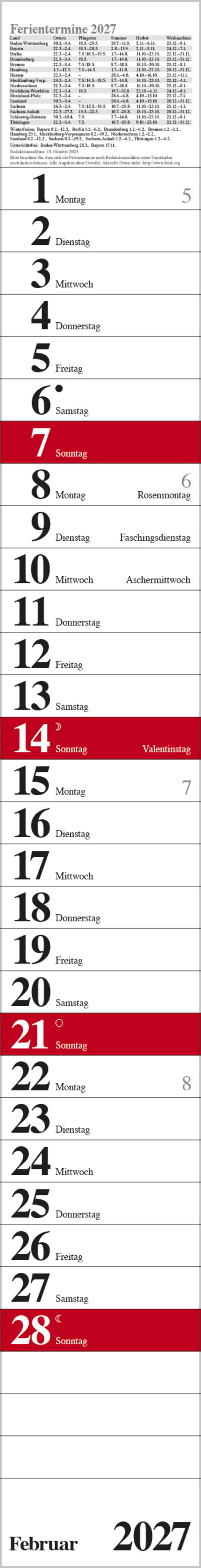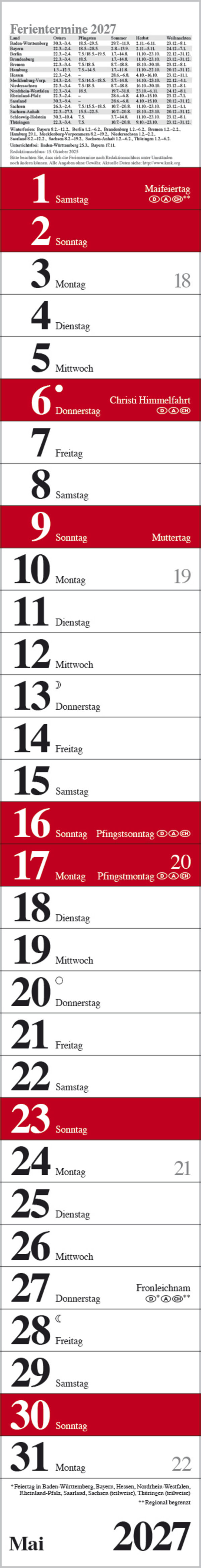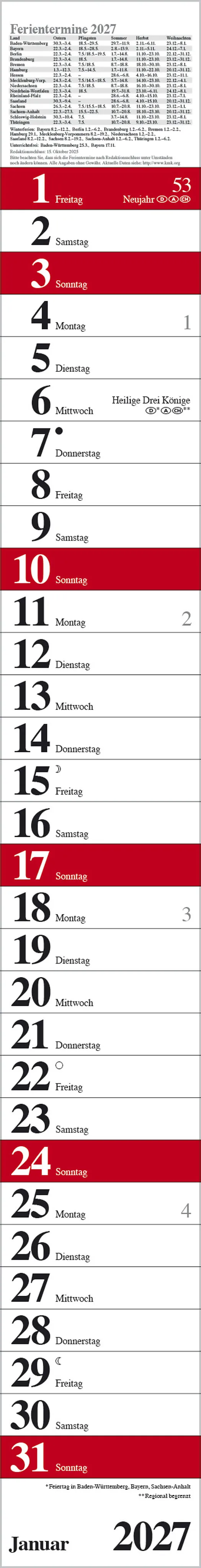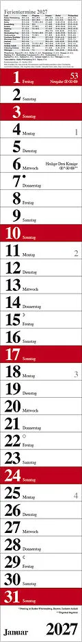 Produktmerkmale • Format: 11,4 x 89 cm; schmaler Wandkalender mit viel Platz für Termine • Kalendarium auf Deutsch mit hervorgehobenen Sonn- und Feiertagen für D, A und CH • Mit Spiralbindung und Datumsschieber • Gedruckt auf umweltfreundli...