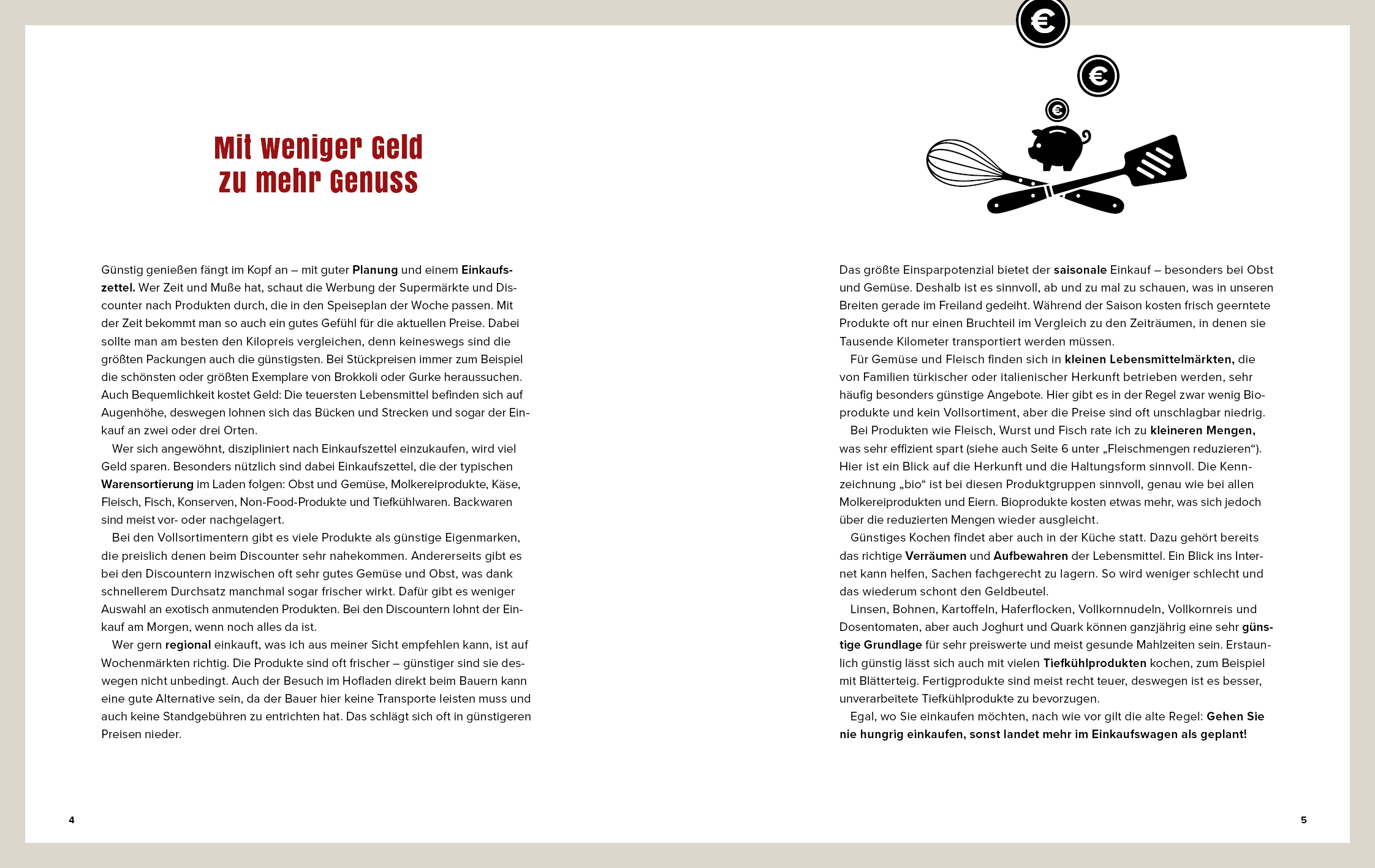 Großer Genuss für kleines Geld Zwei oder drei günstige Lieblingsgericht zaubert fast jeder aus dem Hut, und seien es nur Variationen Spaghetti mit Sauce. Will man aber ernsthaft und dauerhaft das eigene Budget entlasten, braucht man schon eine größere Rezepta...