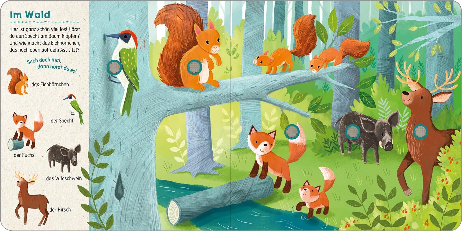 Wie macht der kleine Fuchs? Wie klingt der Specht? Und hörst du das Wildschwein grunzen? In diesem allerersten Soundbuch für die Kleinsten ab 18 Monaten gibt es jede Menge unterschiedlicher Waldtiere zu entdecken. Auf der jeweils linken Buchseite führt ein kurzer Erzähltext in die Szene ein. Darunter sind 5 Waldmotive mitsamt der passenden Benennung abgebildet, die sich rechts in der wimmeligen Szene versteckt haben. Hast du das Tier entdeckt? Dann drücke darauf und das passende Geräusch ertönt. Die stabilen Pappseiten bieten sich hervorragend für kleine Kinderhände an. So macht das Suchen und Hören jede Menge Spaß - nicht nur für die Kleinen von uns.