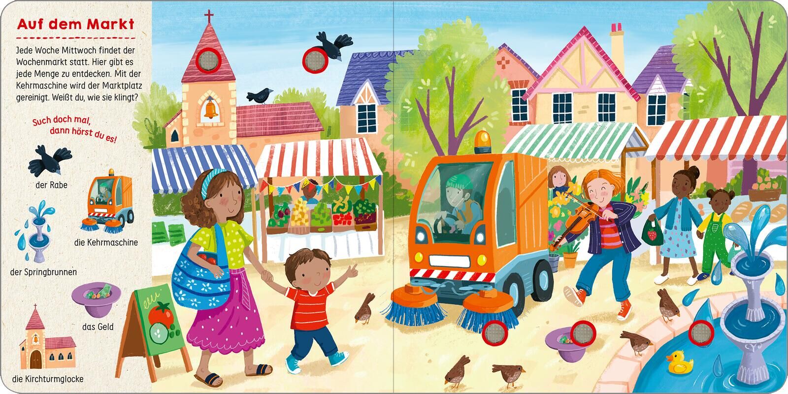 Auf insgesamt 5 Themenseiten haben sich die unterschiedlichsten Gegenstände der Kleinen versteckt. Von der Szene auf dem Marktplatz über den Kindergarten bis hin zum Badezimmer ist der Tagesablauf der Kleinsten abgebildet. Entdeckst du die Gegenstände vom Seitenrand in der bunten Szene wieder? Auf Knopfdruck werden diese zum Leben erweckt und bieten einen spannenden Sound. Ein perfekter Kleinkindbegleiter und zudem ein toller Start in die Bilderbuchwelt. Für alle kleinen und großen Sachensuchenfans!