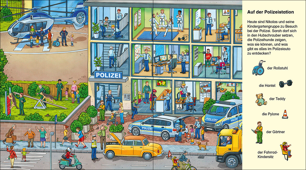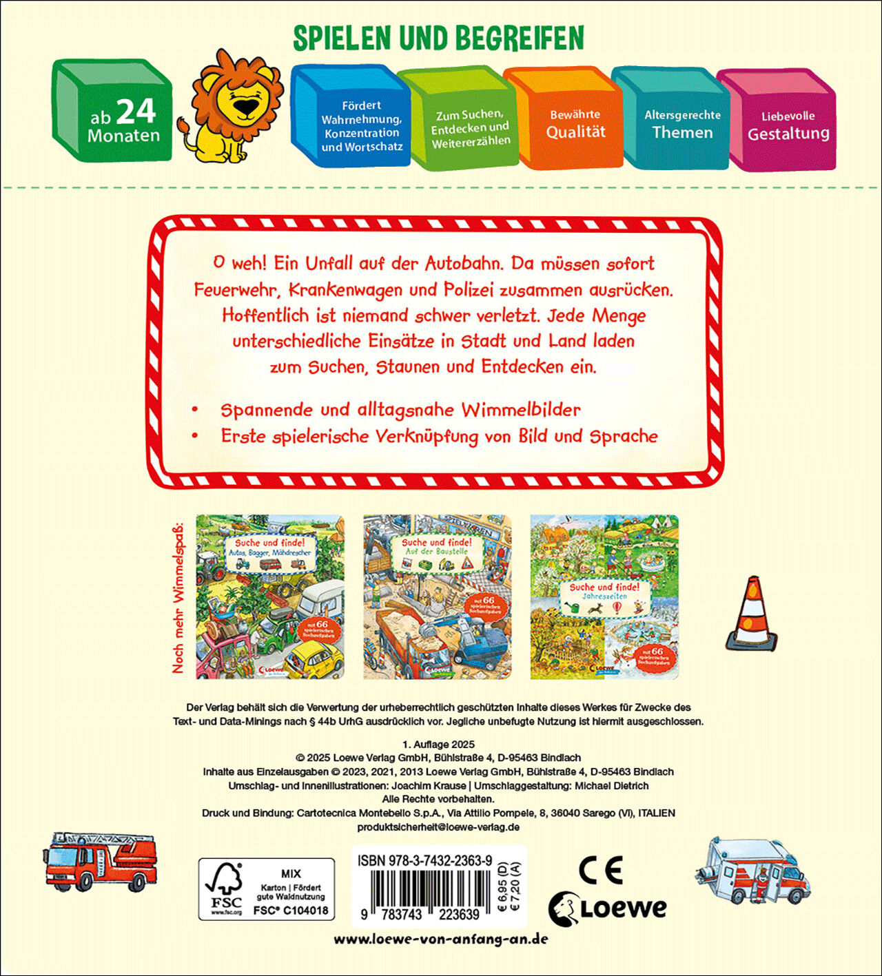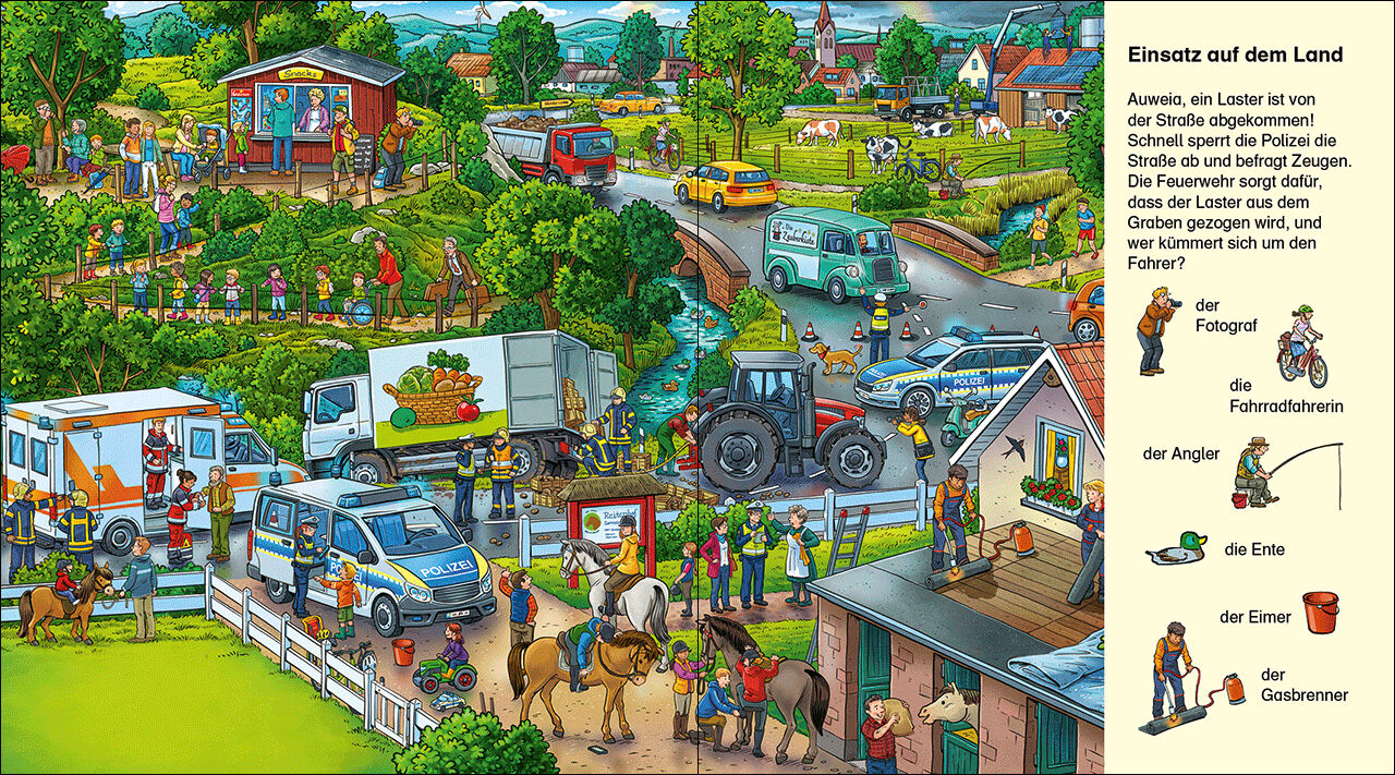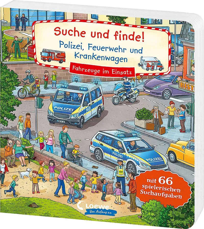 O weh! Ein Unfall auf der Autobahn. Da müssen sofort Feuerwehr, Krankenwagen und Polizei zusammen ausrücken. Hoffentlich ist niemand schwer verletzt. Jede Menge unterschiedliche Einsätze in Stadt und Land laden zum Suchen, Staunen und Entdecken ein. Spannende...
