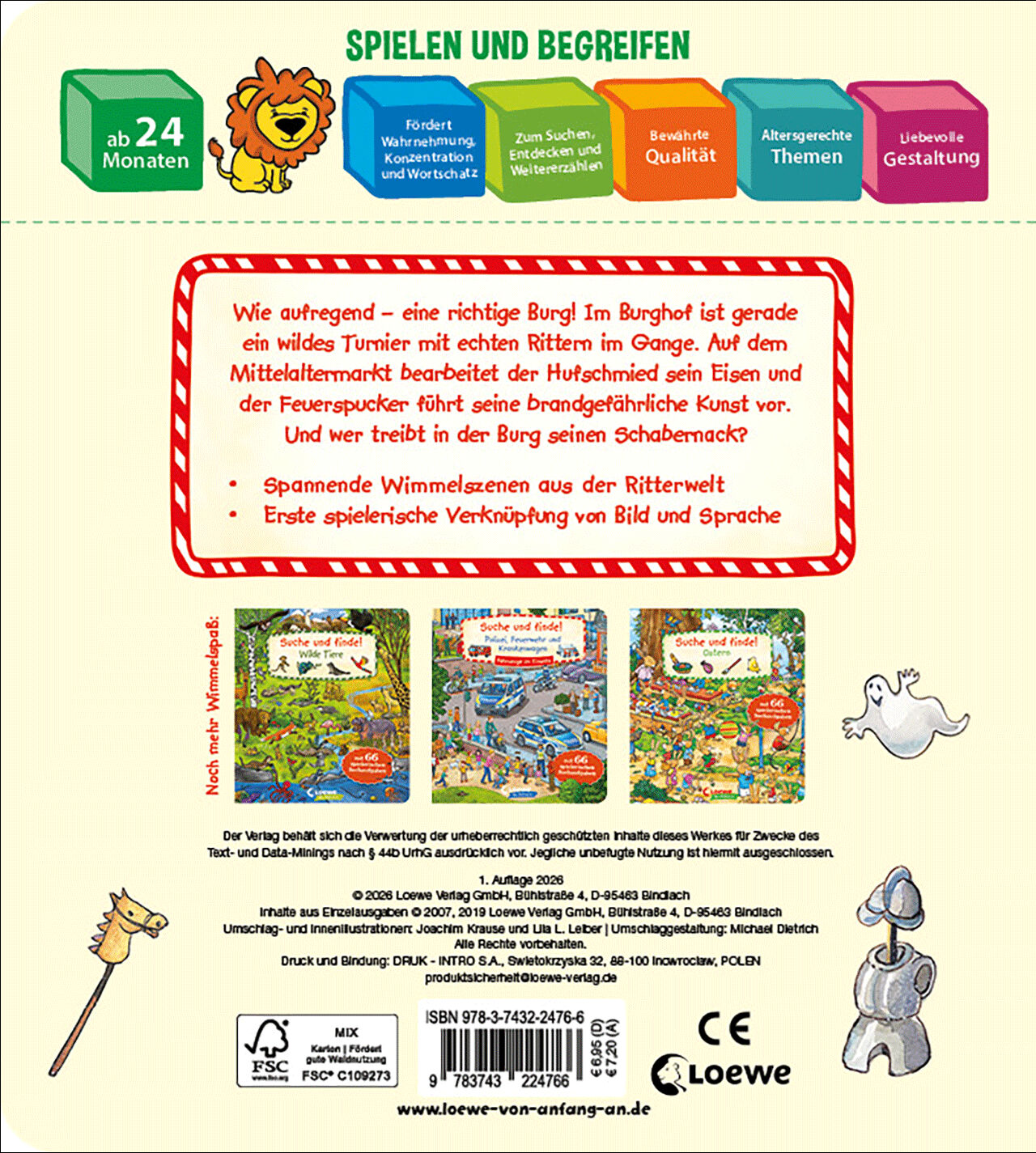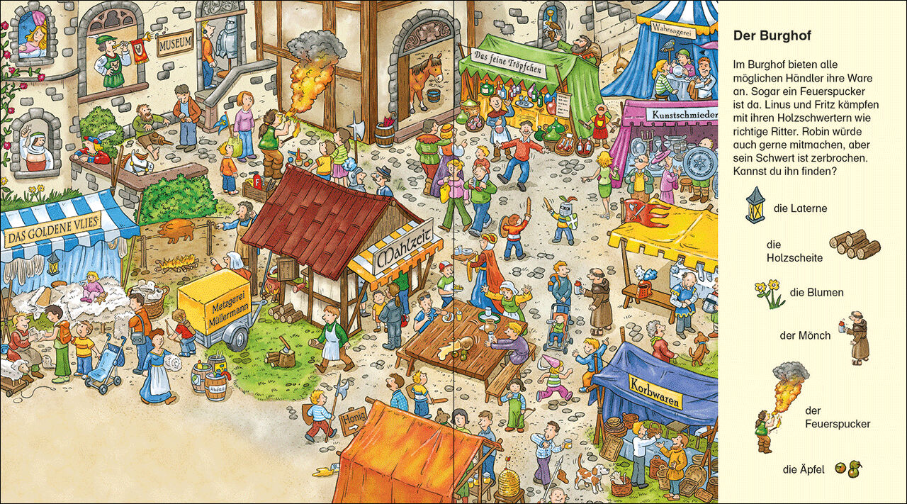 Wie aufregend eine richtige Burg! Im Burghof ist gerade ein wildes Turnier mit echten Rittern im Gange. Auf dem Mittelaltermarkt bearbeitet der Hufschmied sein Eisen und der Feuerspucker führt seine brandgefährliche Kunst vor. Und wer treibt in der Burg seinen...