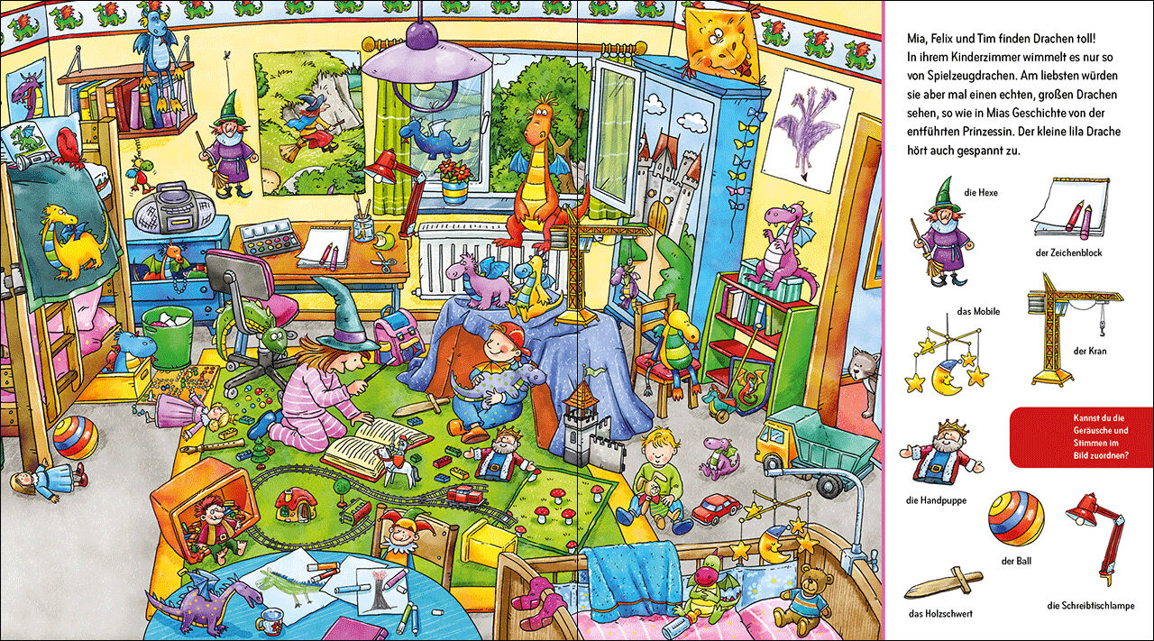 Sehen und Hören, Suchen und Staunen Die Suche und finde! Sound-Wimmelbücher sorgen für spannende**und langanhaltende Beschäftigung . Lieblings-Themenwelten wie Gute Nacht , Natur , Weihnachten , Feuerwehr oder Drachen und Ritter wecken die Entdeckerlust und bieten unzählige Gesprächsanlässe. Wimmelige Bilder zum Immer-wieder-Anschauen , extralange Sounds und viele Suchvignetten auf jeder Doppelseite machen die Bücher zu unterhaltsamen Begleitern. Garantierter Spiel- und Lesespaß mit wichtigem Lerneffekt für Kinder ab 2 Jahren** bis ins Vorschulalter!