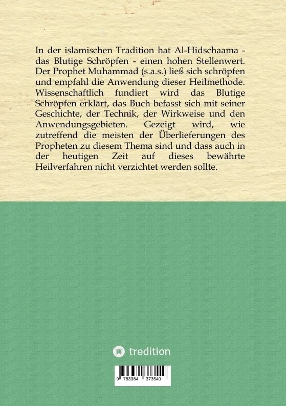 In der islamischen Tradition hat Al-Hidschaama - das Blutige Schröpfen - einen hohen Stellenwert. Der Prophet Muhammad (s.a.s.) ließ sich schröpfen und empfahl die Anwendung dieser Heilmethode. Praktisch in allen Regionen und Kulturen der Welt, auch in Deutsch...