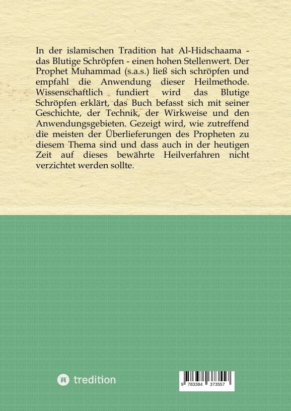 In der islamischen Tradition hat Al-Hidschaama - das Blutige Schröpfen - einen hohen Stellenwert. Der Prophet Muhammad (s.a.s.) ließ sich schröpfen und empfahl die Anwendung dieser Heilmethode. Praktisch in allen Regionen und Kulturen der Welt, auch in Deutsch...