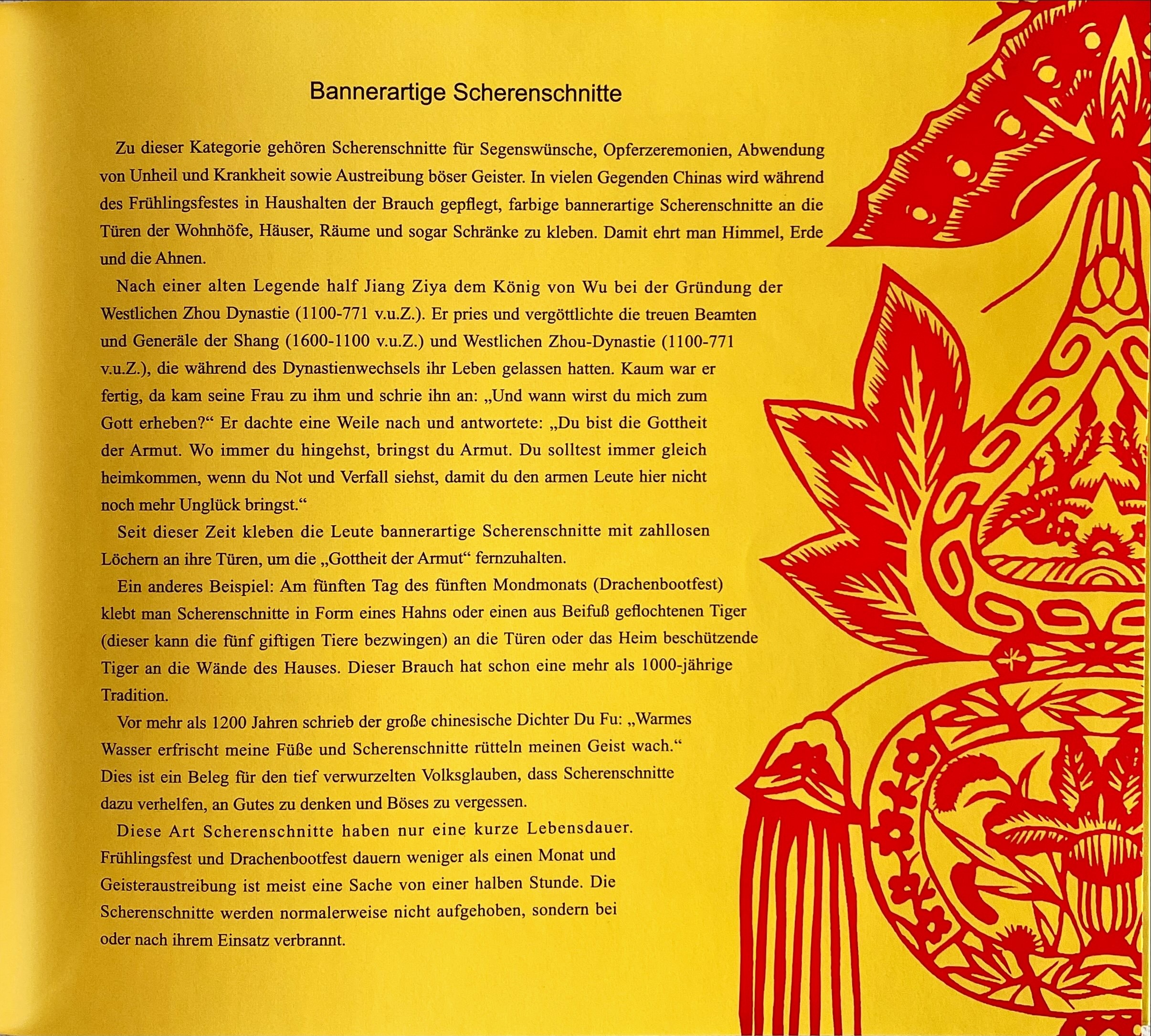 Chinesische Scherenschnitte blicken auf eine lange Geschichte zurück. Laut Aufzeichnungen wurden schon vor mehr als 2100 Jahren ein Scherenschnitt von Li Furen, der Lieblingskonkubine des Kaisers, angefertigt, um des Kaisers Trauer zu lindern. In der Zeit der ...