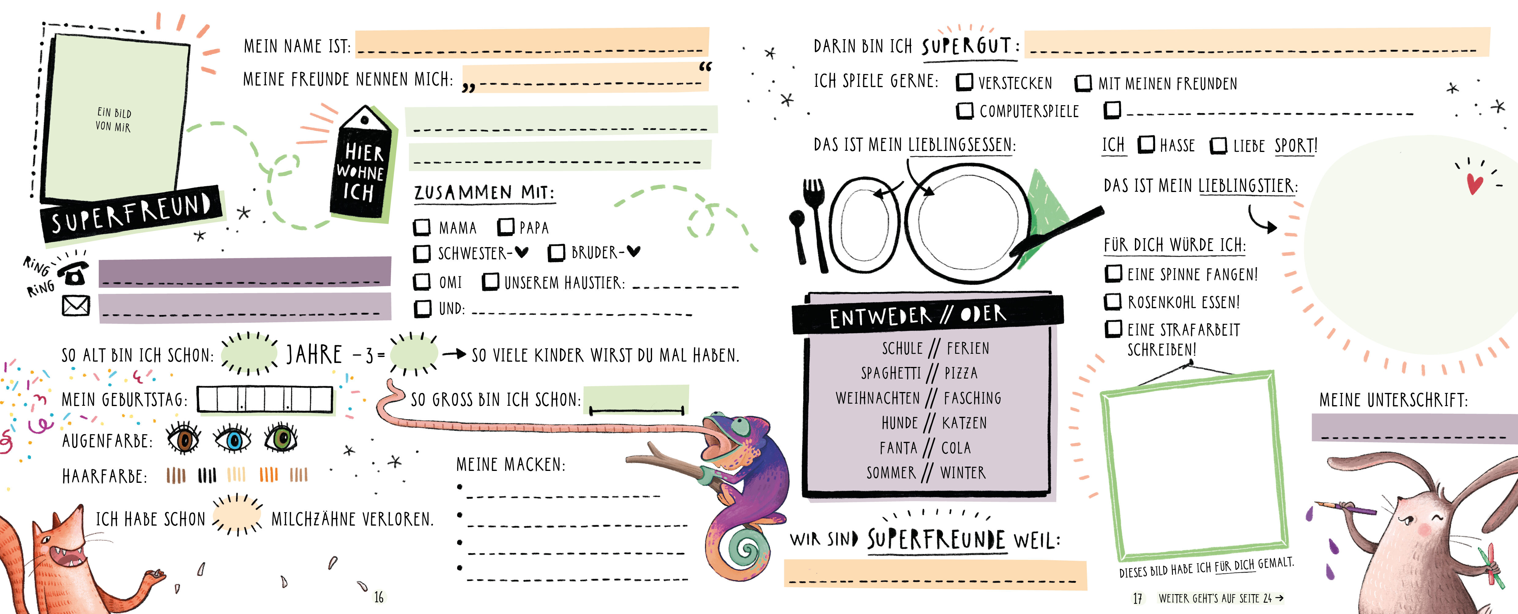 Ein Freundebuch für die Ewigkeit! Mit den vielfältigen Motiven eignet sich das originelle Erinnerungsalbum in der beliebten Kritzeloptik für Mädchen und Jungen gleichermaßen. Alle Freunde bekommen ihre eigene Seite und bleiben somit ein Leben lang in Erinneru...