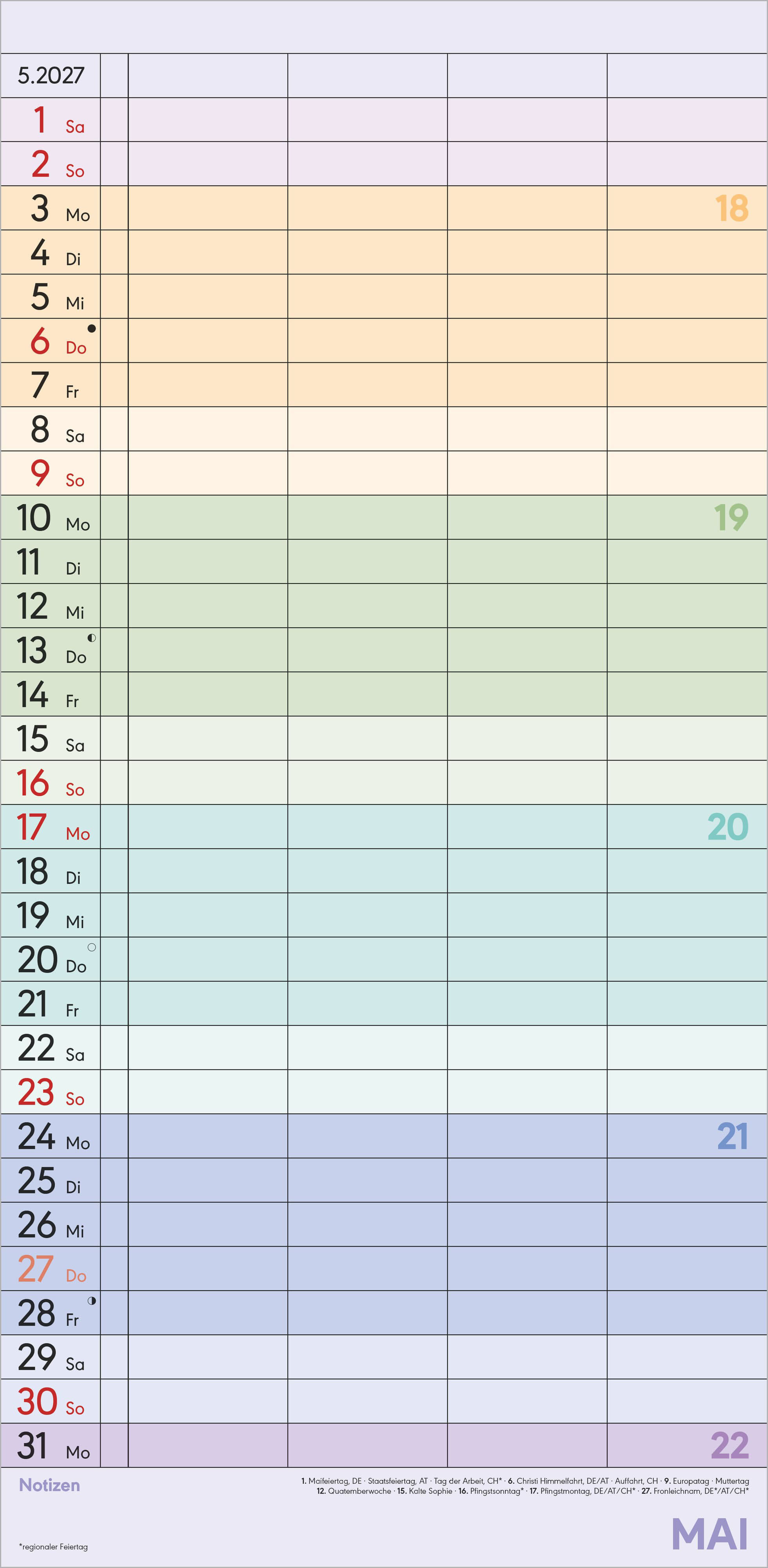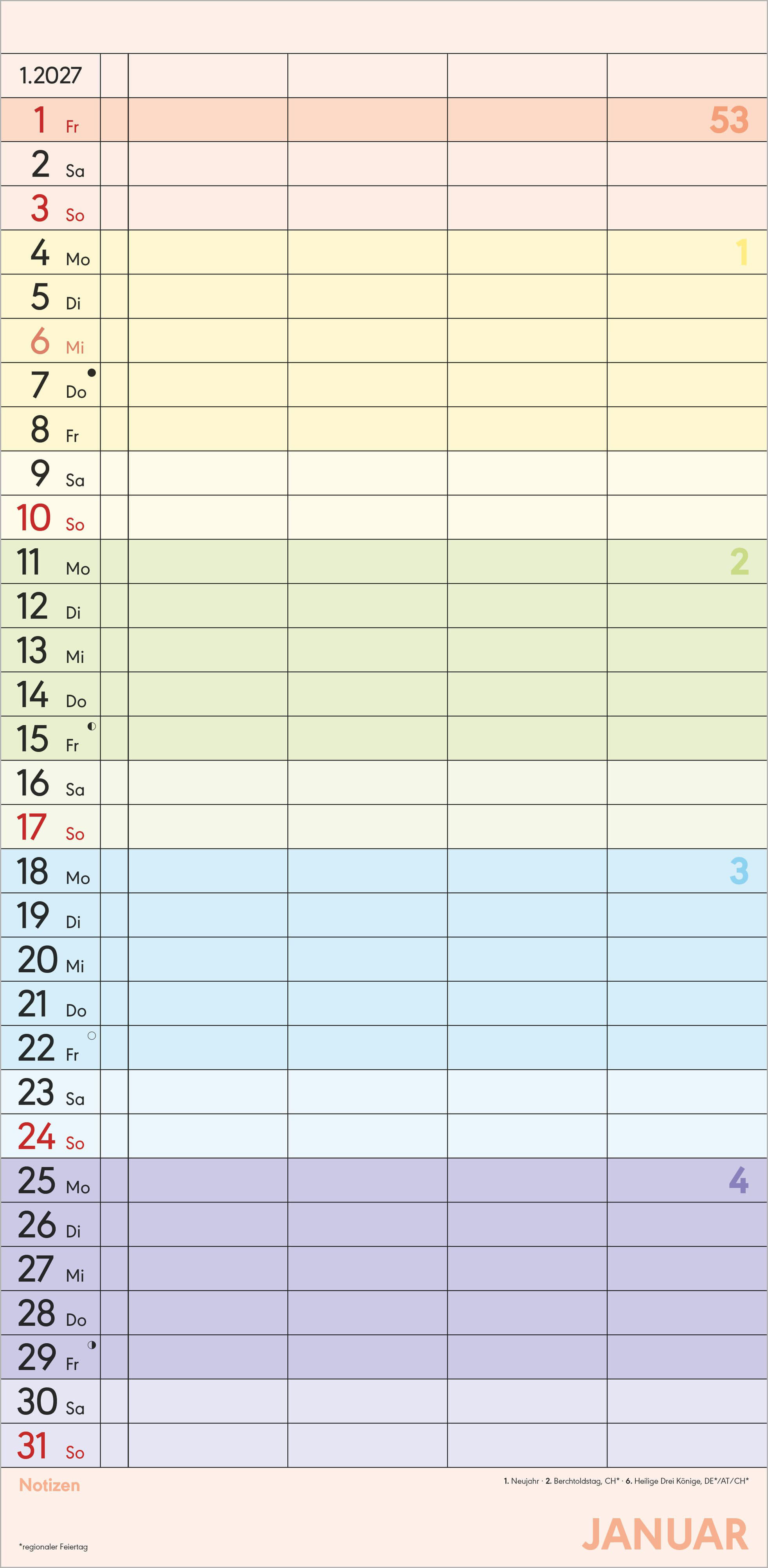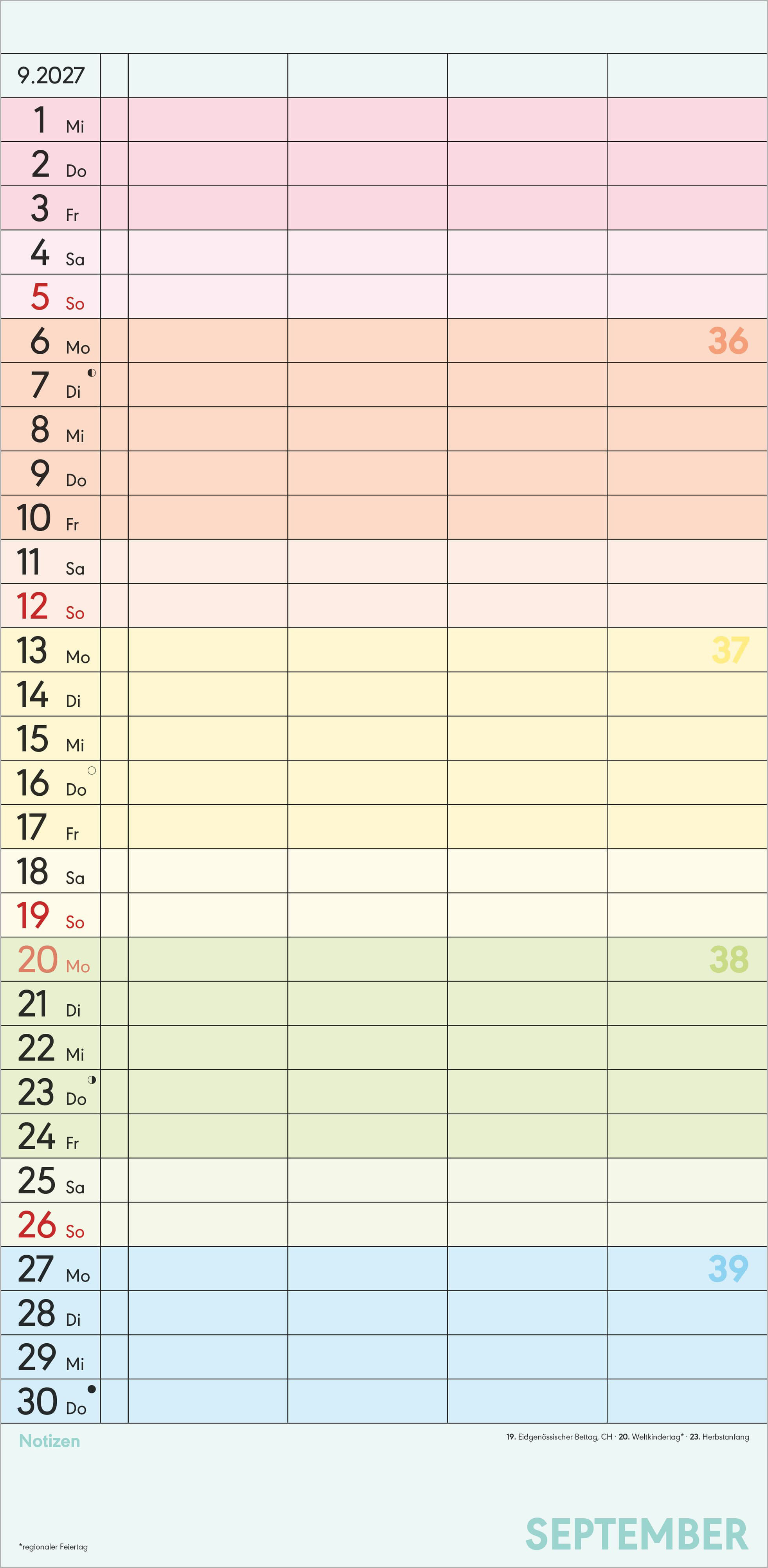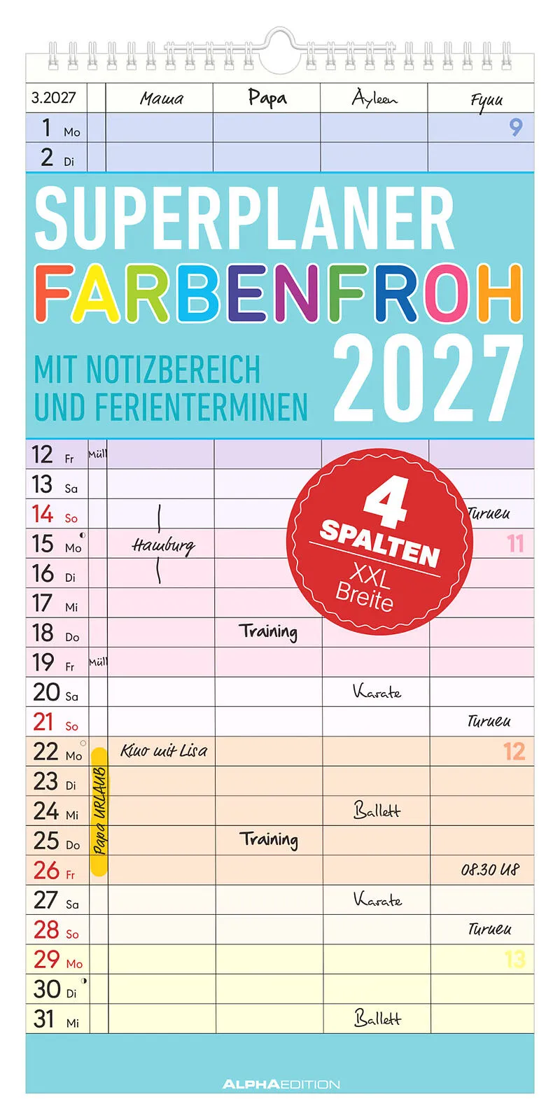 Mit dem Alpha Edition Superplaner Farbenfroh 2027 behalten Sie alle Termine Ihrer Familie perfekt im Blick ob gemeinsamer Ausflug, Spieleabend oder wichtige Schulveranstaltung. Dank der vier übersichtlichen Spalten lassen sich die Termine von Familien- oder W...