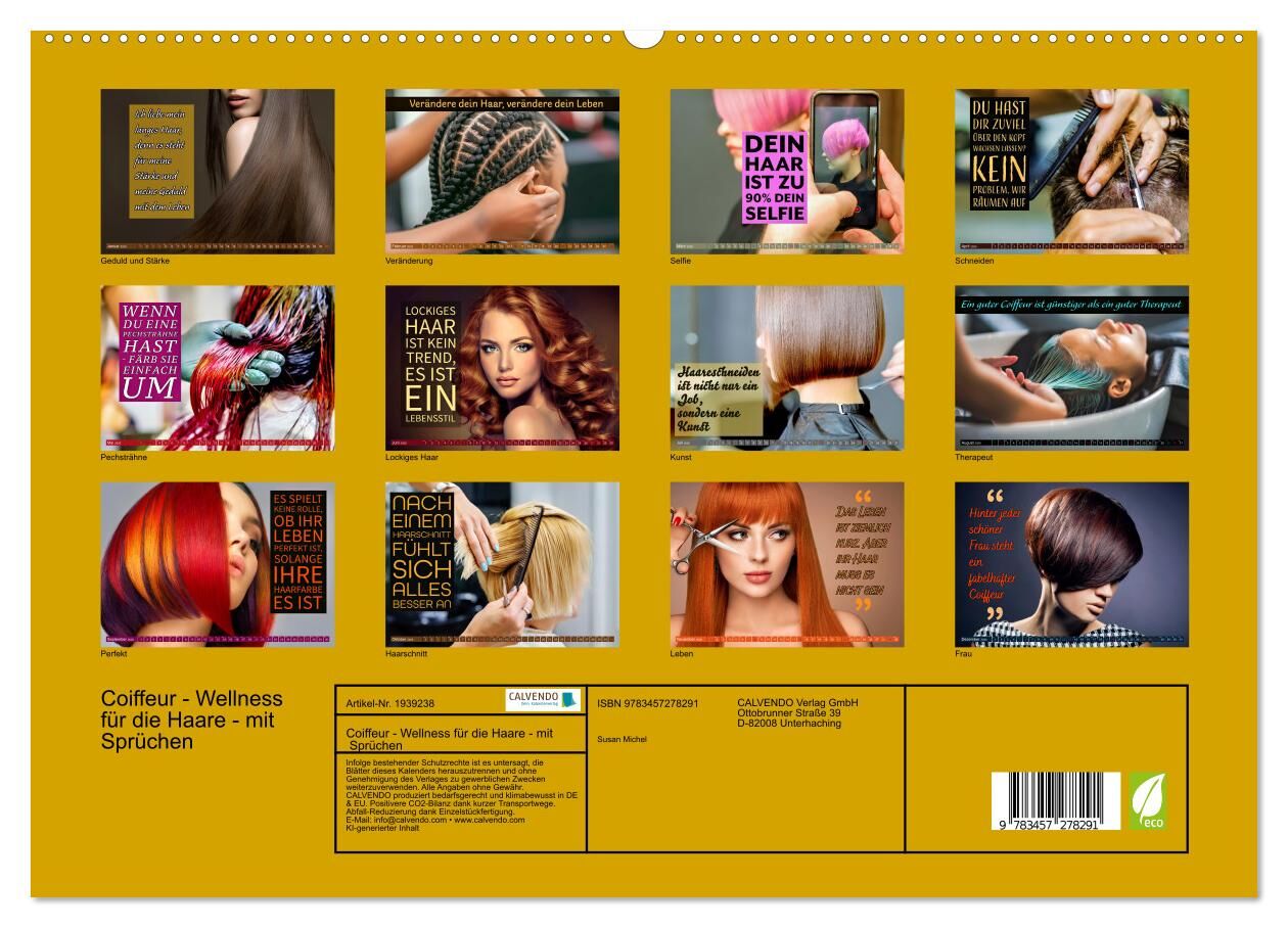 Entdecken Sie mit diesem Kalender Coiffeur Wellness für die Haare jeden Tag eine neue Inspiration rund um Schönheit, Pflege und Wohlbefinden. Ob motivierende Zitate, humorvolle Weisheiten dieser Kalender begleitet Sie durch das Jahr und schenkt Ihnen kleine Mo...