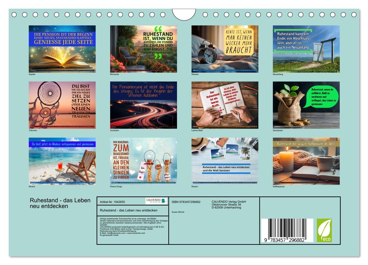 Der Ruhestand ist kein Ende, sondern ein neuer Anfang! Dieser inspirierende Kalender begleitet Sie Monat für Monat mit motivierenden Sprüchen, wunderschönen Bildern , um diese besondere Lebensphase in vollen Zügen zu genießen. Entdecken Sie neue Hobbys, planen...