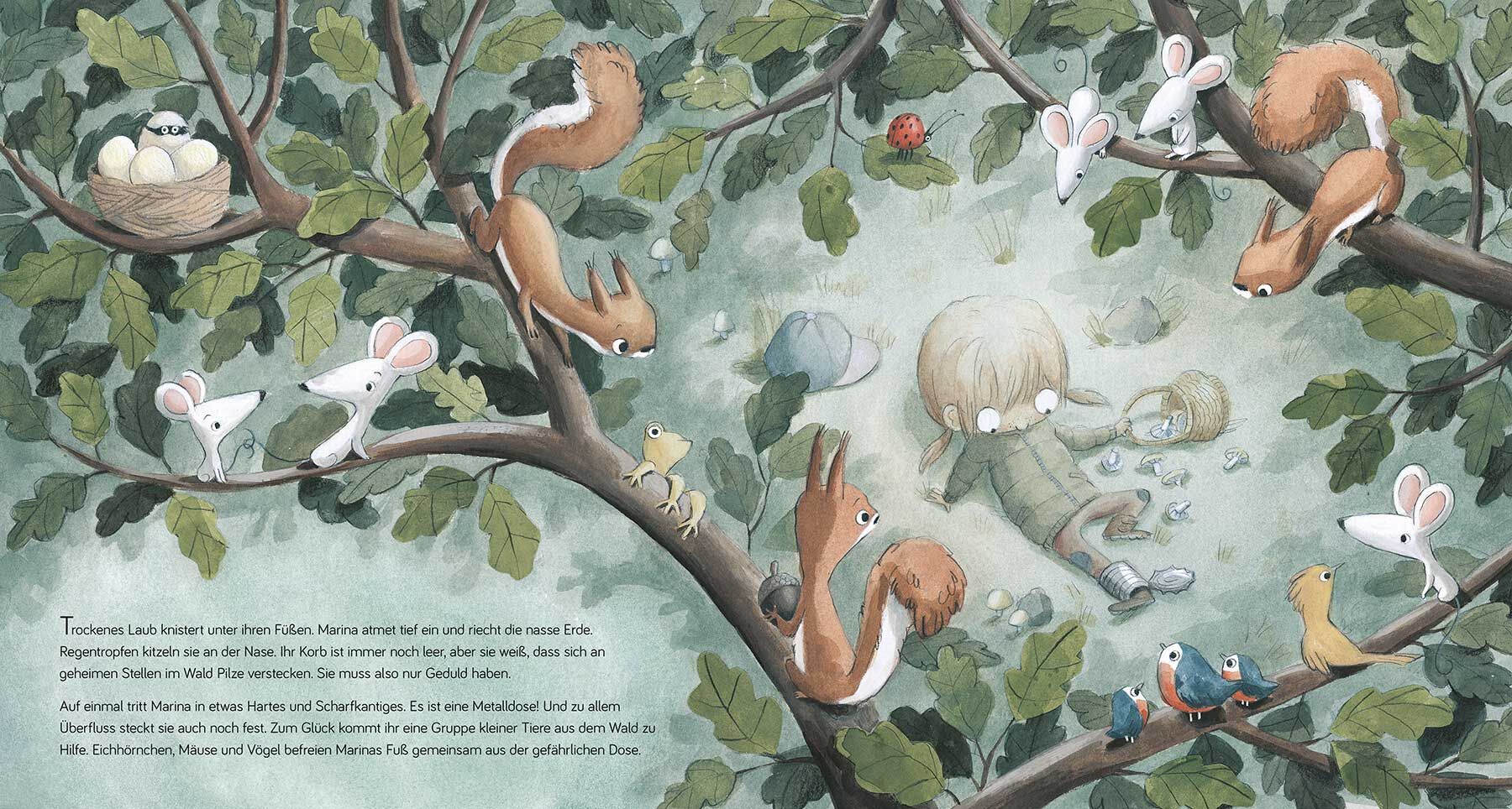 Marie spaziert durch den Wald. Plötzlich tritt sie auf einen harten, scharfen Gegenstand - eine Metalldose! Und zu allem Überfluss steckt sie auch noch fest. Dann kommt ihr eine Gruppe von Waldtieren zur Hilfe. Was für ein Glück, dass sich Marina auf ihre Unte...