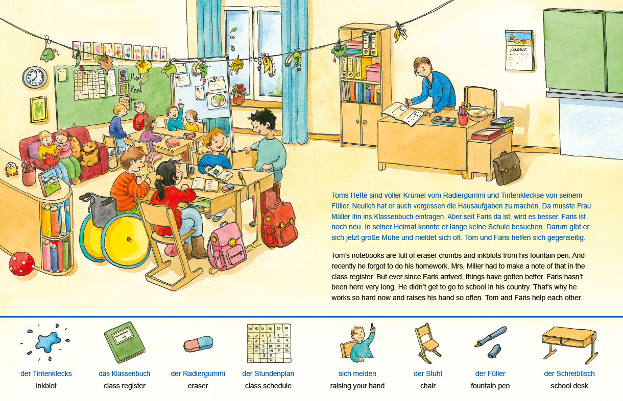 In der Schule passieren oft die lustigsten Sachen. Das finden auch Faris, Tom und Naima. Komm doch mit! Farbenfrohe Illustrationen laden zum Betrachten ein und eine Wort-Bild-Leiste auf jeder Seite greift wichtige Gegenstände erneut auf und fördert gezielt das...