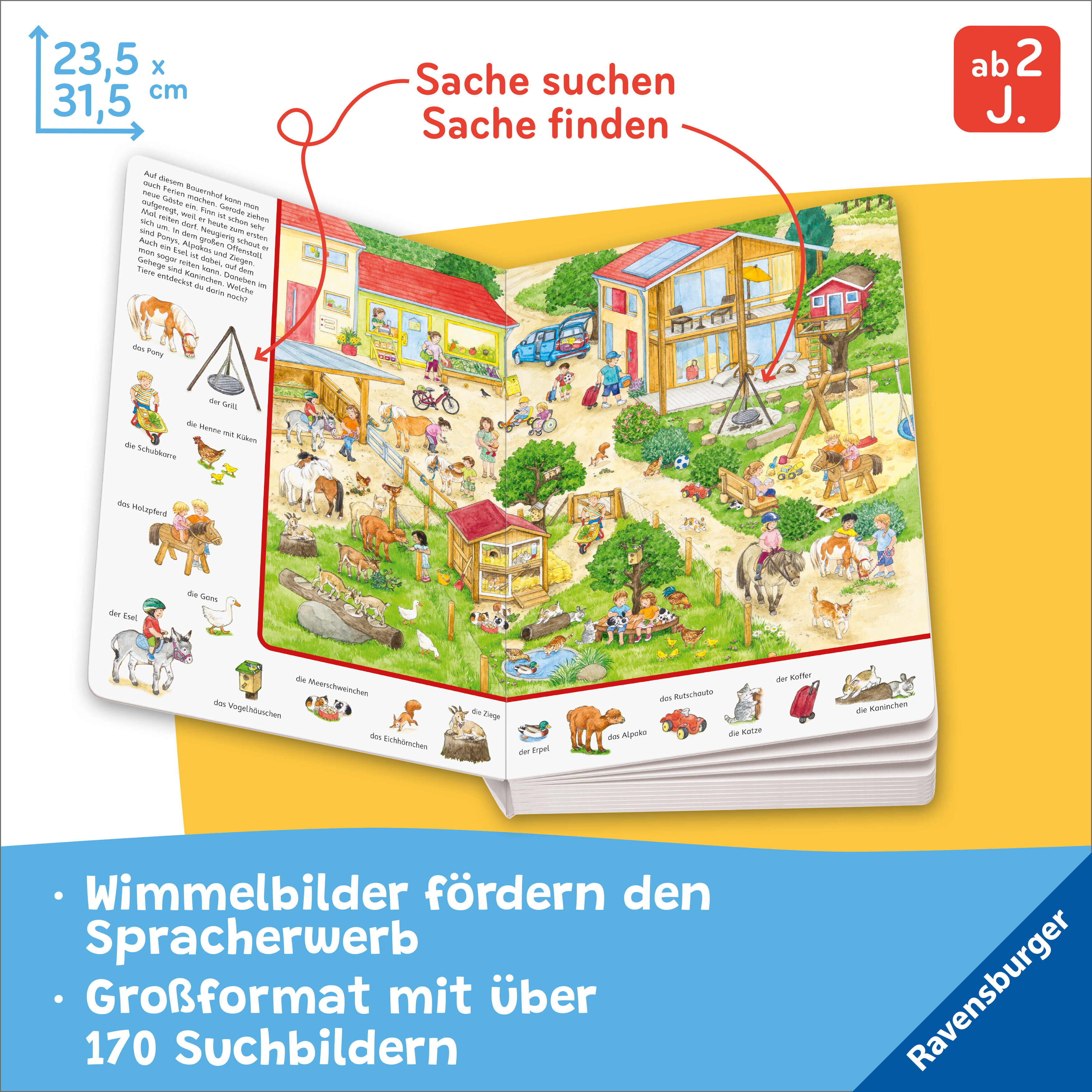 Jubiläumsband für kleine "Sachen suchen" Fans! Bilderbuchvielfalt und jede Menge Suchspaß! Auf elf abwechslungsreichen Wimmelbuchseiten können Kinder ab 2 Jahren über 170 "Sachen suchen". Wichtige Kinderthemen wie der Bauernhof, die Stadt, der Kindergarten, di...