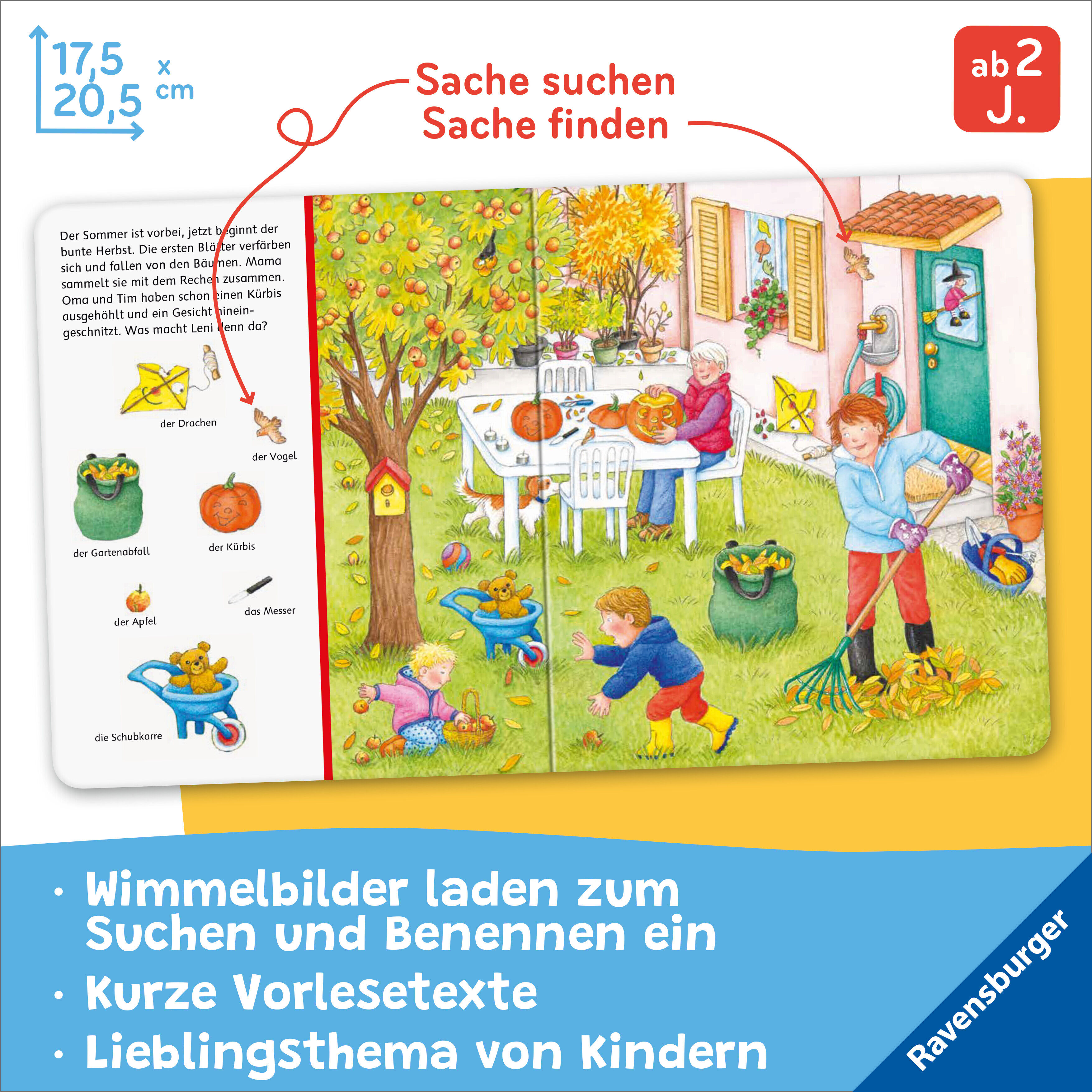Raschelnde Blätter, fallende Kastanien und steigende Drachen - Jetzt ist der Herbst da! Auf stimmungsvollen Wimmelbildern erkunden Kinder ab 2 Jahren den Herbst: wie verändert sich die Natur mit der neuen Jahreszeit? Was lässt die Drachen jetzt am Himmel tanze...
