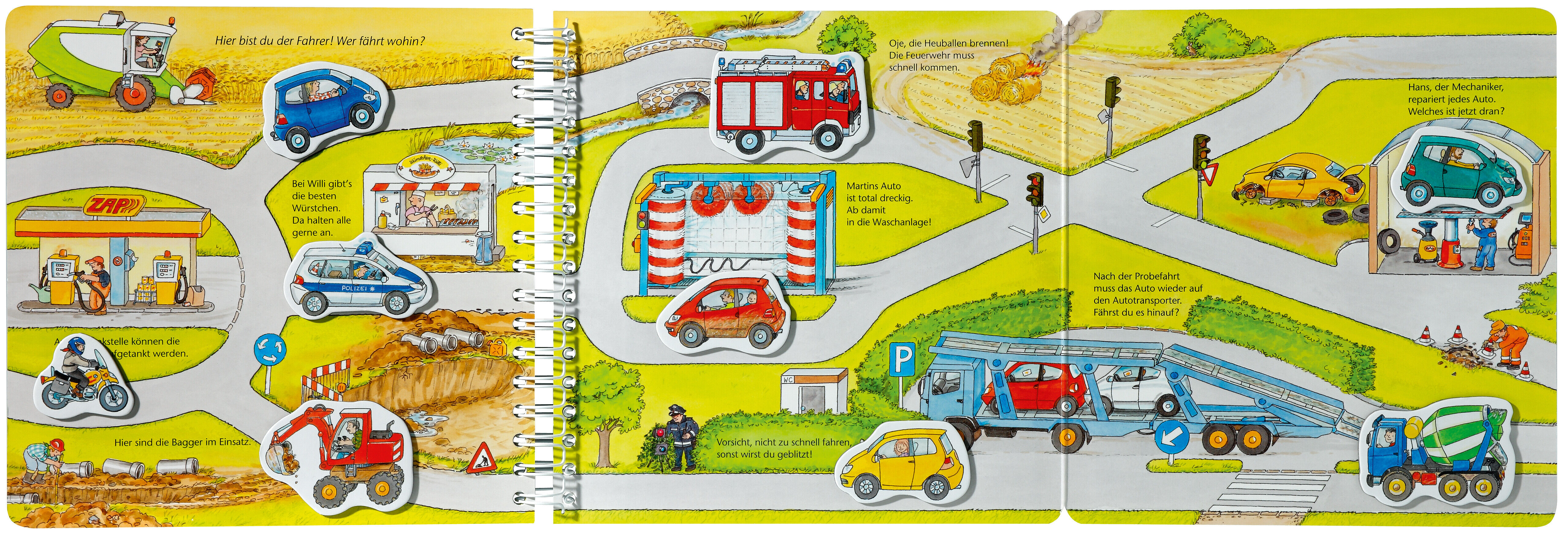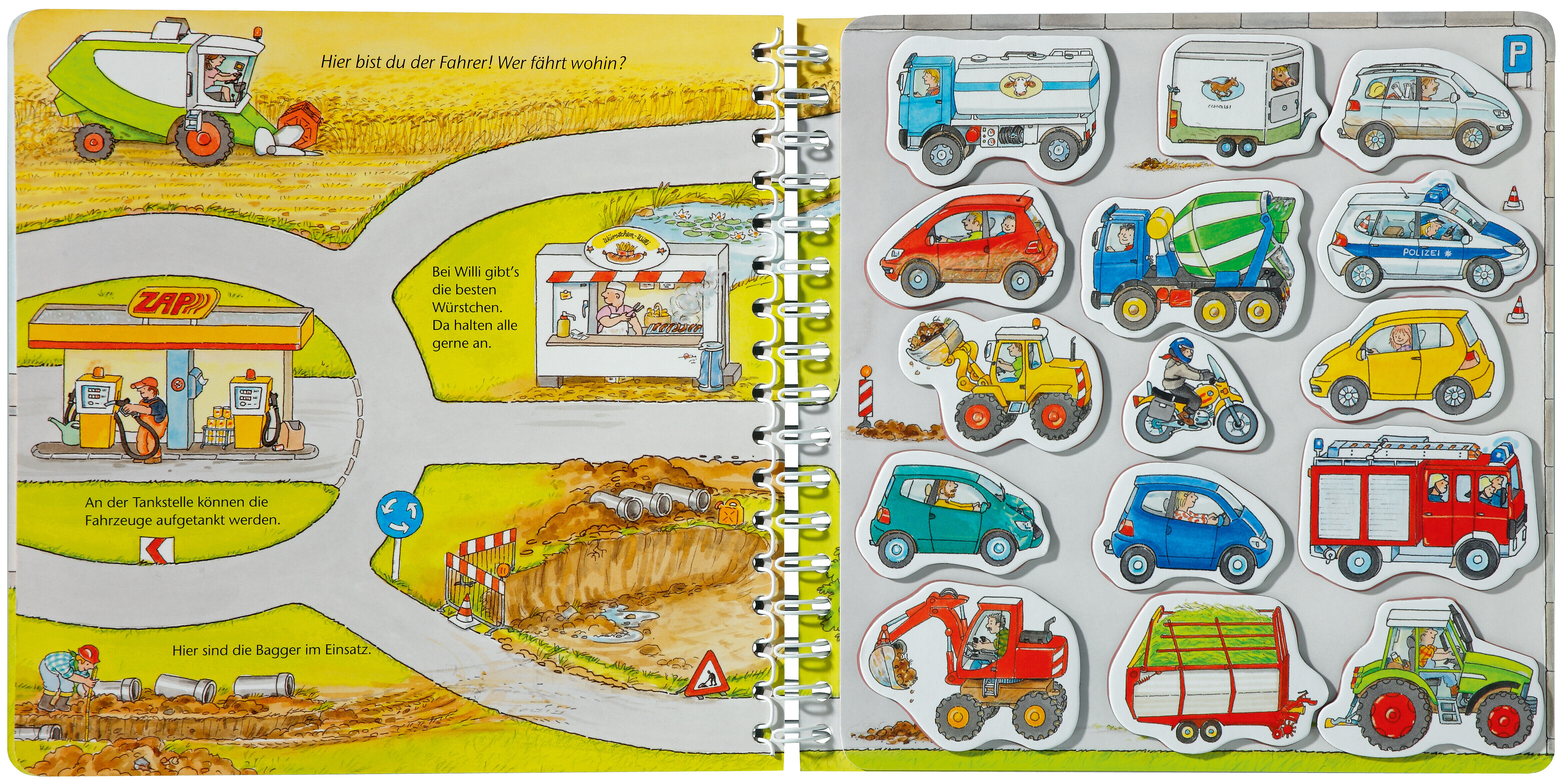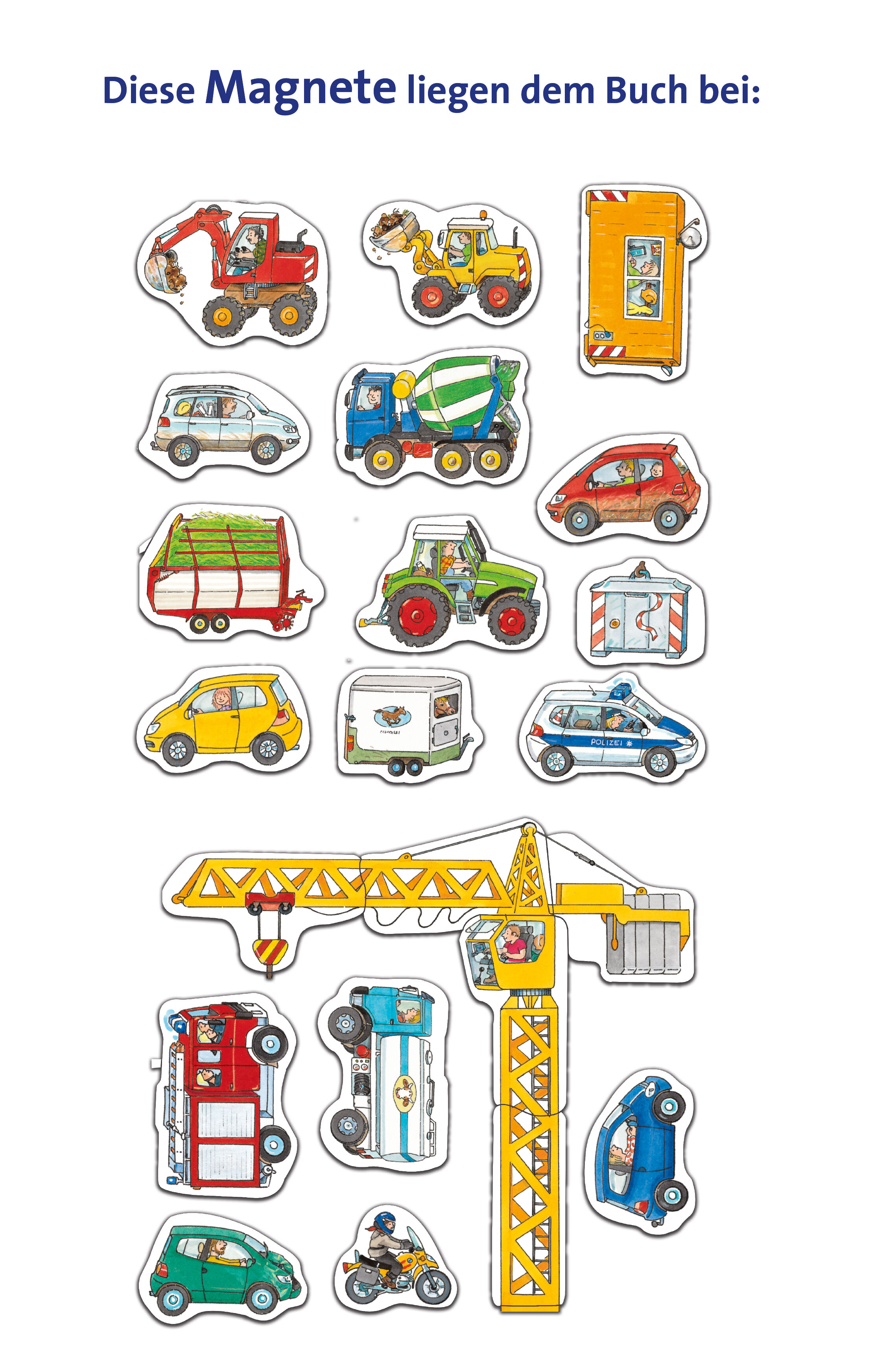 Der Traktor zieht den Ladewagen, auf der Baustelle wird ein Kran aufgebaut und das Feuerwehrauto saust zum Löschen. Aus 22 Magneten können Kinder ab 2 Jahren die passenden Fahrzeuge für die unterschiedlichen Szenen auswählen. Auf der letzten Seite können alle ...