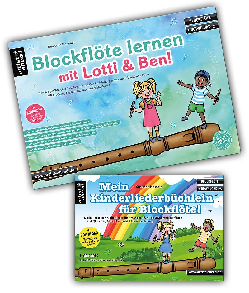 Blockflöte lernen mit Lotti & Ben!Der liebevoll-leichte Einstieg für Kinder ab 3 Jahren die kindgerechte Blockflötenschule mit Liedern, Texten, Musik- & Malspieleninkl. Klavierbegleitung, QR-Codes + Audio-DownloadDiese Blockflötenschule richtet sich an...Blockflöte lernen mit Lotti & Ben!Der liebevoll-leichte Einstieg für Kinder ab 3 Jahren die kindgerechte Blockflötenschule mit Liedern, Texten, Musik- & Malspieleninkl. Klavierbegleitung, QR-Codes + Audio-DownloadDiese Blockflötenschule richtet sich an Kinder ab 3 Jahren im Kindergarten- und Grundschulalter und ist sowohl für den Einzel- als auch für den Gruppenunterricht geeignet. In kleinen, behutsamen Schritten lernen die Kinder, begleitet von ihren Freunden Lotti & Ben, spielerisch die Blastechnik und die Grundlagen der Notenschrift kennen. Die Töne C' bis D'' werden nach und nach eingeführt und ab dem 3. gelernten Ton sind die Kinder bereits in der Lage 2-stimmig miteinander musizieren. Im Download-Bereich können die Einzelstimmen der Lieder sowie eine ansprechende Klavierbegleitung heruntergeladen werden. So können die Kinder klatschend, sprechend, singend oder durch Bewegung die Lieder mit allen Sinnen erfahren. Durch das Mitspielen zur Musik haben die kleinen Anfänger zudem die Möglichkeit sich als richtige Musiker zu fühlen. Der Kreativität der Kinder und Lehrer sind also keine Grenzen gesetzt. Musik- und Malspiele lockern das Flötelernen ergänzend auf und runden das pädagogische Konzept von Blockflöte lernen mit Lotti & Ben! perfekt ab.--Mein Kinderliederbüchlein für Blockflöte! (A5-Querformat)Die beliebtesten Kinderlieder für Anfänger das Allround-Spielbüchlein für 1 bis 2 Sopranblockflöteninkl. Klavierbegleitung, QR-Codes + Audio-DownloadMein Kinderliederbüchlein für Blockflöte! eine schöne Sammlung der beliebtesten Kinder- & Volkslieder für kleine & große Blockflötenspielerinnen. Die vorliegenden Stücke eignen sich für das erste Musizieren und stellen eine ideale Ergänzung zur Anfängerschule Blockflöte lernen mit Lotti & Ben! dar. Gemeinsames Musizieren macht am meisten Spaß, daher sind die Lieder für zwei Sopranblockflöten als Duette gesetzt und auch für den Gruppenunterricht geeignet. Zusätzlich gibt es eine passende Klavierbegleitung. Die Stücke haben maximal ein Vorzeichen (C-Dur, F-Dur und G-Dur) und können bereits von Anfängerinnen gespielt werden. Die 2. Stimme ist jeweils leichter spielbar und kommt mit wenigen Tönen aus. Im Download-Bereich können sowohl die Einzelstimmen als auch die Klavierstimme als Noten-PDF ausgedruckt werden. Zum Anhören, Üben und Mitspielen können alle Stimmen als Audio- und MP3-Dateien heruntergeladen werden. Die Lieder sind ebenfalls mit anderen Instrumenten spielbar und eignen sich, dank der zugehörigen Texte, auch prima zum Mitsingen. Mein Kinderliederbüchlein für Blockflöte! die liebevoll ausgewählte Kinderlieder-Sammlung im handlichen A5-Format und das passende Geschenk für kleine & große Blockflötenspieler*innen!Du erhältst 32 beliebte und sehr leicht spielbare Kinderlieder für Blockflöte (inkl. Klavierbegleitung) mit zugehörigen Texten!Alle meine Entchen • Ringel, Ringel, Reihe • Auf der Mauer, auf der Lauer • Dornröschen war ein schönes Kind • Ist ein Mann in'n Brunn' gefallen • Der Mond ist aufgegangen • Backe, backe Kuchen • Sonne, liebe Sonne • Fuchs, du hast die Gans gestohlen • Hoppe, hoppe Reiter • Mein Hut, der hat drei Ecken • Heile, heile Segen • In meinem kleinen Apfel • Häschen in der Grube • Die Affen rasen durch den Wald • Alle Vögel sind schon da • Kuckuck, Kuckuck • Wer hat die schönsten Schäfchen • Laterne, Laterne • Weißt du, wie viel Sternlein stehen • Guter Mond, du gehst so stille • Im Märzen der Bauer • Amazing Grace • Schlaf, Kindlein, schlaf • Mary had a little lamb • Hänschen klein • Summ, summ, summ • Hänsel und Gretel • Au claire de la lune • Old MacDonald had a farm • Sur le pont d'Avignon • Der Kuckuck und der Esel--QR-Codes, Download, Klavierbegleitung & Audio-CDScanne die im Buch enthaltenen QR-Codes mit dem Smartphone oder Tablet und gelange direkt zu den Hörbeispielen. Unter artist-ahead-download.de stehen alle Kinderlieder (mit Original- und Einzelstimmen) sowie die Klavierbegleitung (mit Notendateien) als Audio- und MP3-Dateien zum Download zur Verfügung. Eine Audio-CD mit allen Titeln zu diesem Buch ist in unserem Onlineshop unter artist-ahead.de erhältlich.