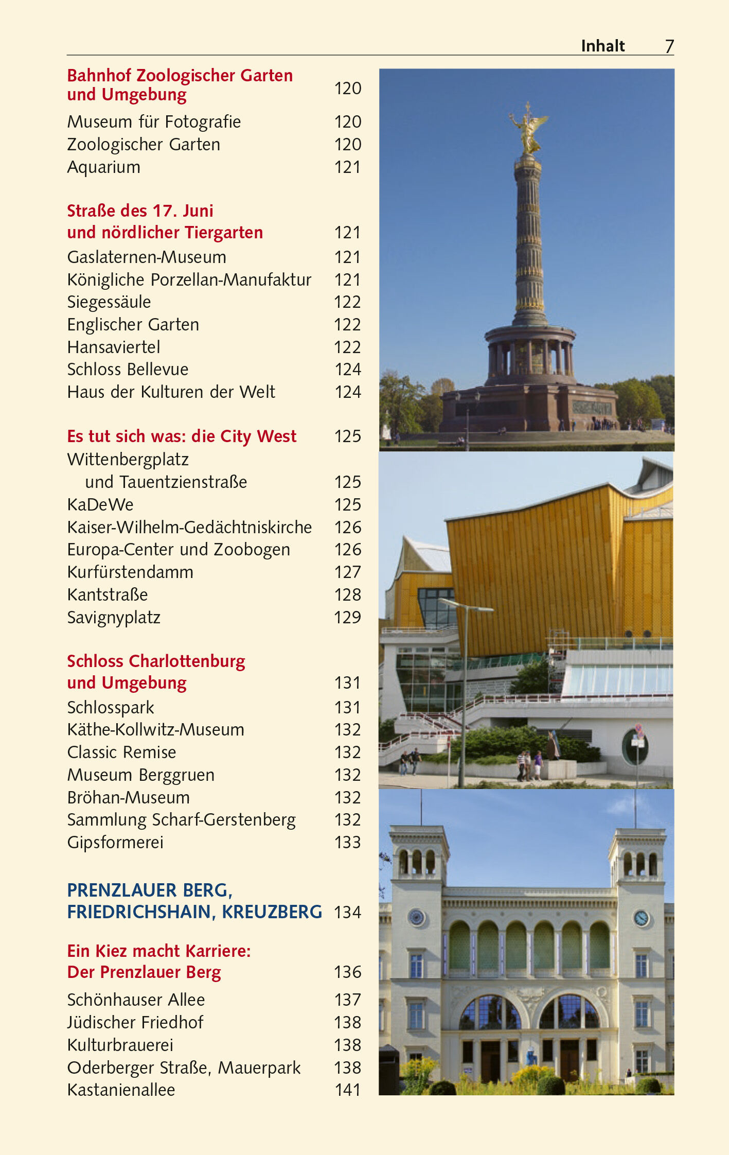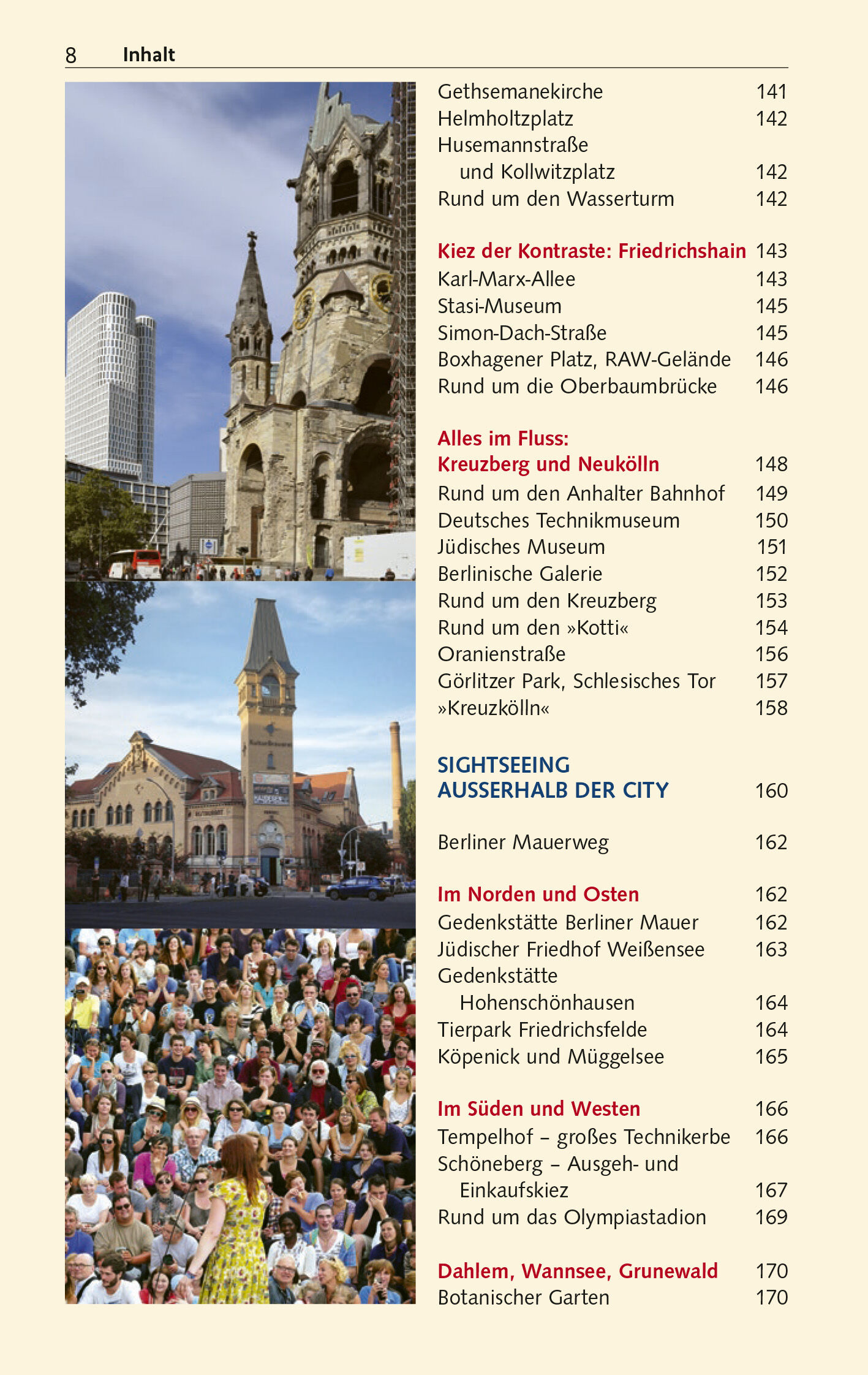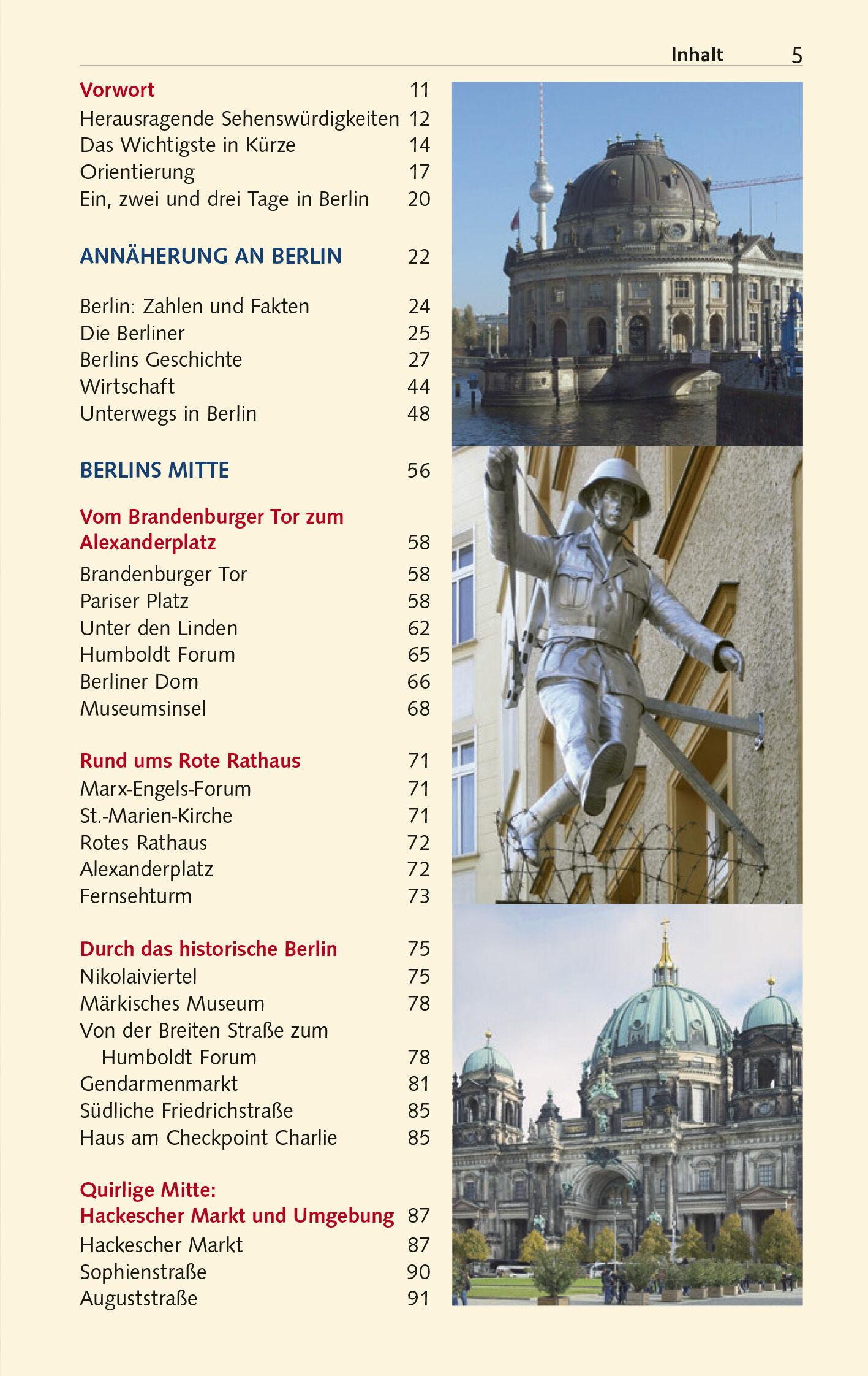 Berlin ist immer eine Reise wert auch eine kurze. Die abwechslungsreiche Museumslandschaft, ein buntes Nachtleben und der Charme des Unfertigen ziehen Menschen aus aller Welt in die Spree-Metropole. Spaziergänge führen zu den wichtigsten Sehenswürdigkeiten: vom Brandenburger Tor über die Museumsinsel zum Alexanderplatz, zum Potsdamer Platz und durch das Regierungsviertel. Die City West mit Ku'damm, Zoologischem Garten und Schloss Charlottenburg wird ebenso präsentiert wie die Kiez-Highlights in Prenzlauer Berg, Friedrichshain, Kreuzberg und Neukölln. Wer länger bleibt, findet Anregungen für Ausflüge in die Außenbezirke und ins nahe Potsdam. Und auch wer schon öfter in Berlin war, wird beim nächsten Besuch wieder Neues entdecken.