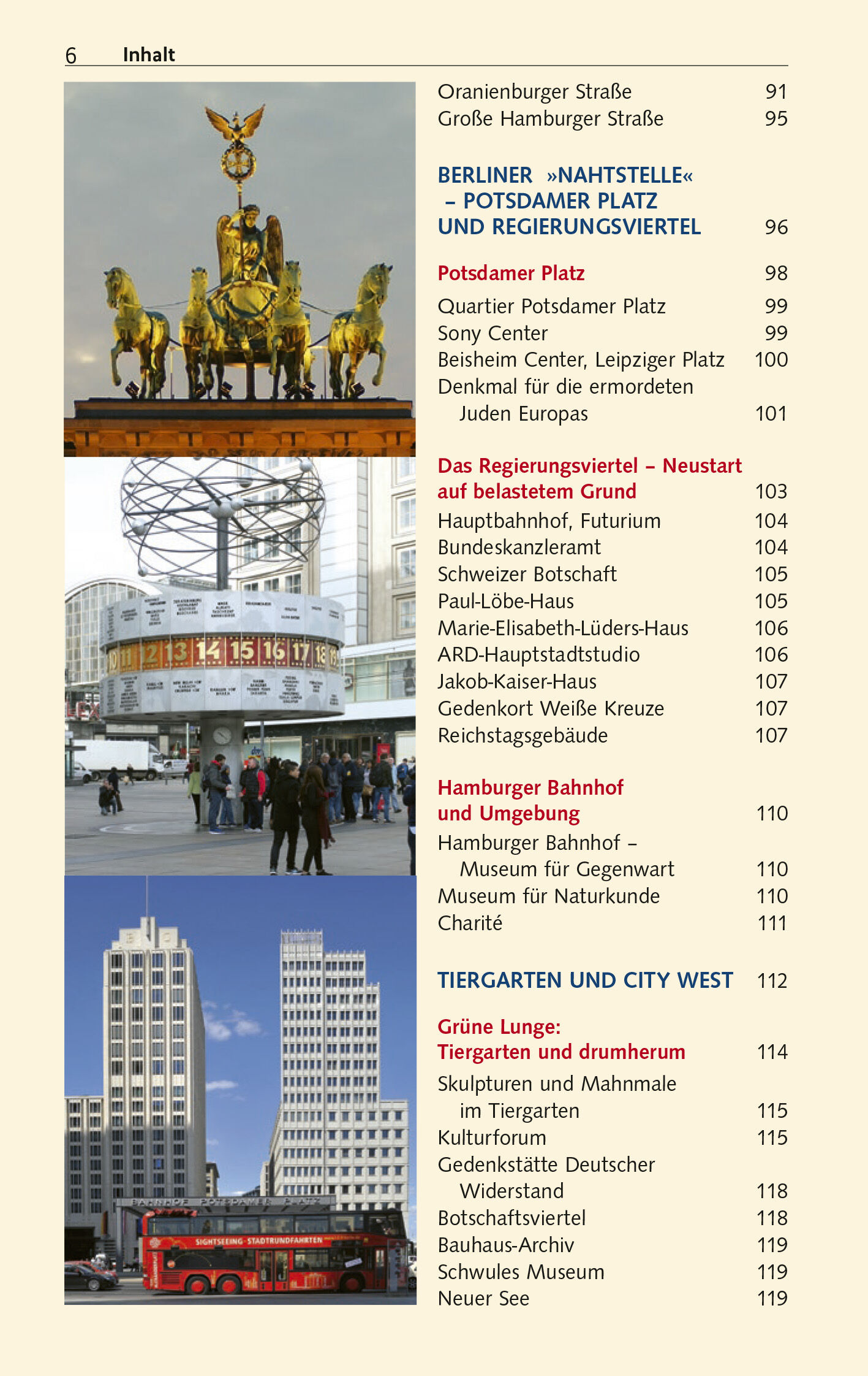 INHALTSVERZEICHNIS Vorwort 11 Herausragende Sehenswürdigkeiten 12 Das Wichtigste in Kürze 14 Orientierung 17 Ein, zwei und drei Tage in Berlin 20 ANNÄHERUNG AN BERLIN 23 Berlin: Zahlen und Fakten 24 Die Berliner 25 Berlins Geschichte 27 Wirtschaft 44 Unterwegs in Berlin 48 BERLINS MITTE 57 Vom Brandenburger Tor zum Alexanderplatz 58 Brandenburger Tor 58 Pariser Platz 58 Unter den Linden 62 Humboldt Forum 65 Berliner Dom 66 Museumsinsel 68 Rund ums Rote Rathaus 71 Marx-Engels-Forum 71 St.-Marien-Kirche 71 Rotes Rathaus 72 Alexanderplatz 72 Fernsehturm 73 Durch das historische Berlin 75 Nikolaiviertel 75 Märkisches Museum 78 Von der Breiten Straße zum Humboldt Forum 78 Gendarmenmarkt 81 Südliche Friedrichstraße 85 Haus am Checkpoint Charlie 85 Quirlige Mitte: Hackescher Markt und Umgebung 87 Hackescher Markt 87 Sophienstraße 90 Auguststraße 91 Oranienburger Straße 92 Große Hamburger Straße 95 BERLINER »NAHTSTELLE« POTSDAMER PLATZ UND REGIERUNGSVIERTEL 97 Potsdamer Platz 98 Quartier Potsdamer Platz 99 Sony Center 99 Leipziger Platz, Beisheim Center 100 Denkmal für die ermordeten Juden Europas 101 Das Regierungsviertel Neustart auf belastetem Grund 103 Hauptbahnhof, Futurium 104 Bundeskanzleramt 104 Schweizer Botschaft 105 Paul-Löbe-Haus 105 Marie-Elisabeth-Lüders-Haus 106 ARD-Hauptstadtstudio 106 Jakob-Kaiser-Haus 107 Gedenkort Weiße Kreuze 107 Reichstagsgebäude 107 Hamburger Bahnhof und Umgebung 110 Hamburger Bahnhof Museum für Gegenwart 110 Museum für Naturkunde 110 Charité 111 TIERGARTEN UND CITY WEST 113 Grüne Lunge: Tiergarten und drumherum 114 Skulpturen und Mahnmale im Tiergarten 115 Kulturforum 115 Gedenkstätte Deut…