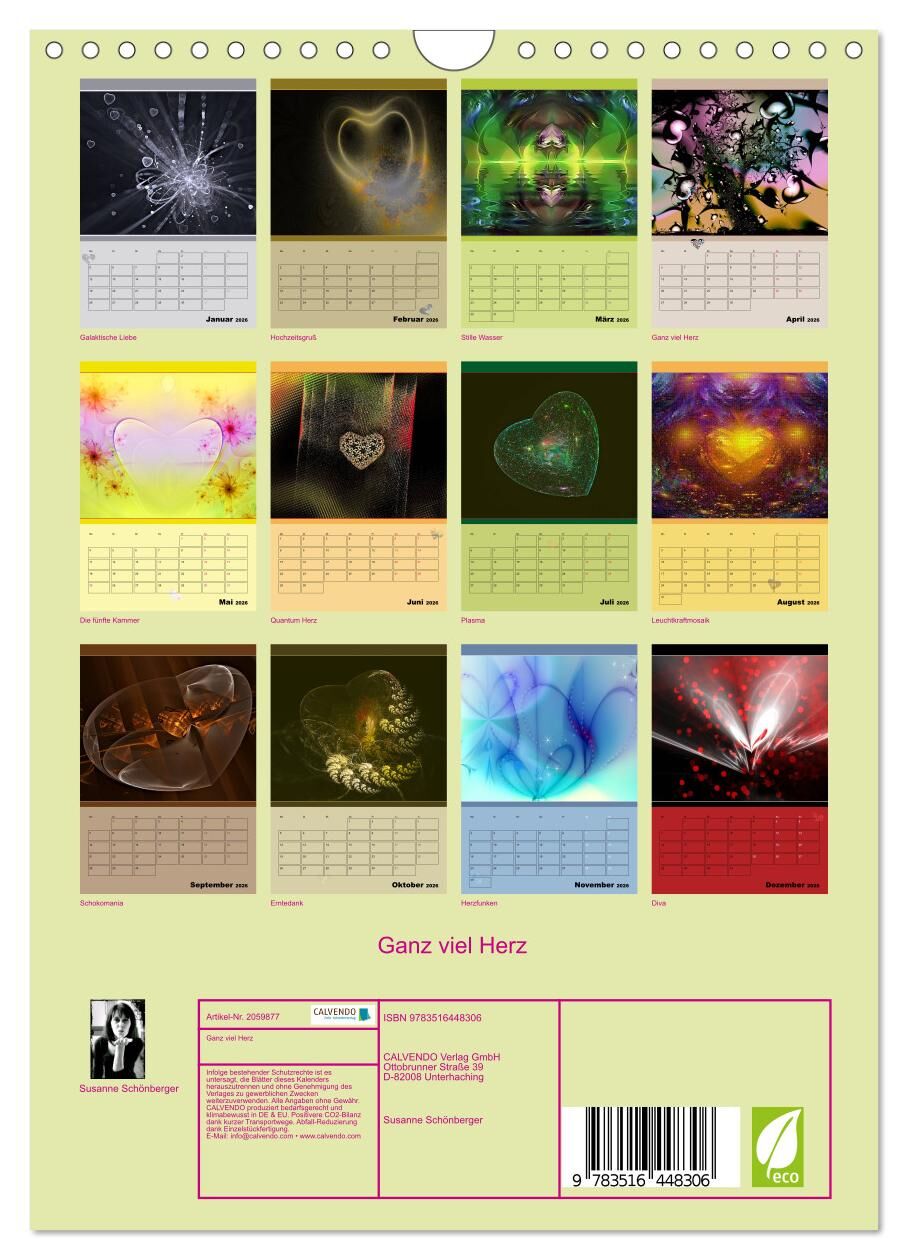 Zwölf unterschiedliche Herzen aus der Welt der Fraktale. Eine Herzenssache für liebende, liebevolle, geliebte und verliebte Menschen. Mit einer Herz-Fläche für Widmungen auf dem Titelblatt. Das Kalendarium gibt die Möglichkeit, Geburtstage und andere Herzensan...