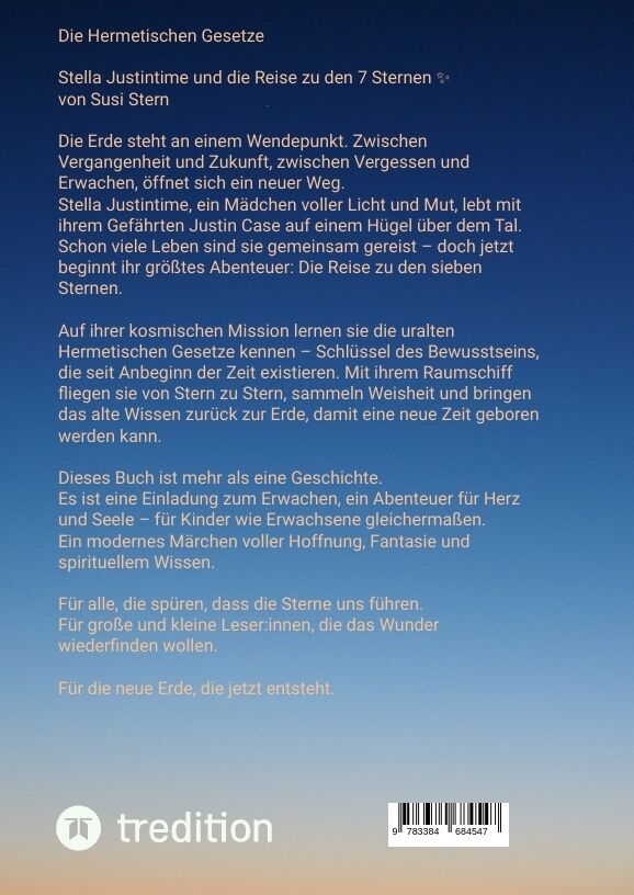 Stella Justintime und die Reise zu den 7 Sternen von Susi Stern Die Erde steht an einem Wendepunkt. Zwischen Vergangenheit und Zukunft, zwischen Vergessen und Erwachen, öffnet sich ein neuer Weg. Stella Justintime, ein Mädchen voller Licht und Mut, lebt mit ih...