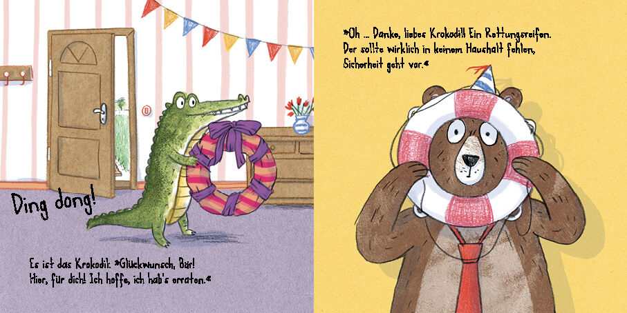 Bär hat Geburtstag und wartet aufgeregt auf seine Gäste, denn er wünscht sich sehnlichst ... Ding-dong! Schon kommen sie, einer nach dem anderen: Krokodil, Gans, Schwein, Katze, Hund. Und jeder Gast bringt ein Geschenk - doch keiner das erhoffte. Ding-dong! Di...