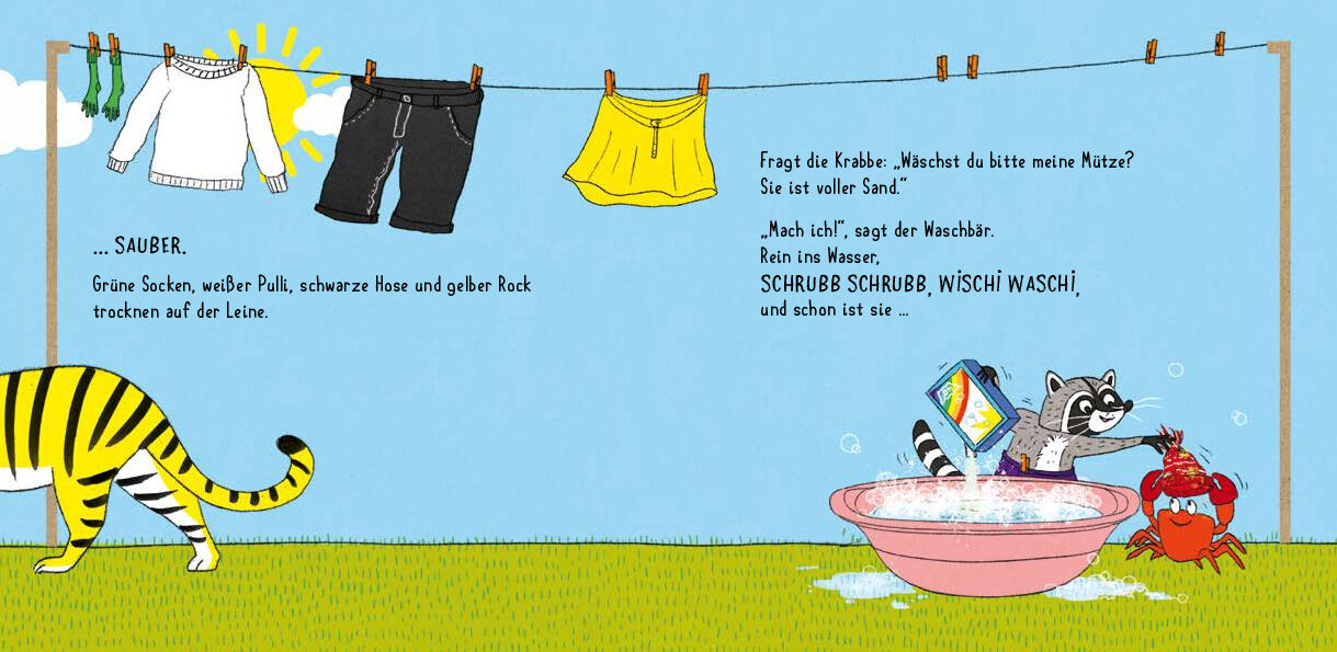 Nichts tut Waschbär lieber, als Schmutziges wieder sauber zu waschen. Schrubb schrubb, wischi waschi. Der Frosch bringt seine grünen Socken, der Tiger seinen gelben Rock, das Schaf den weißen Pulli. Schrubb schrubb, wischi waschi. Immer länger wird die Leine, ...